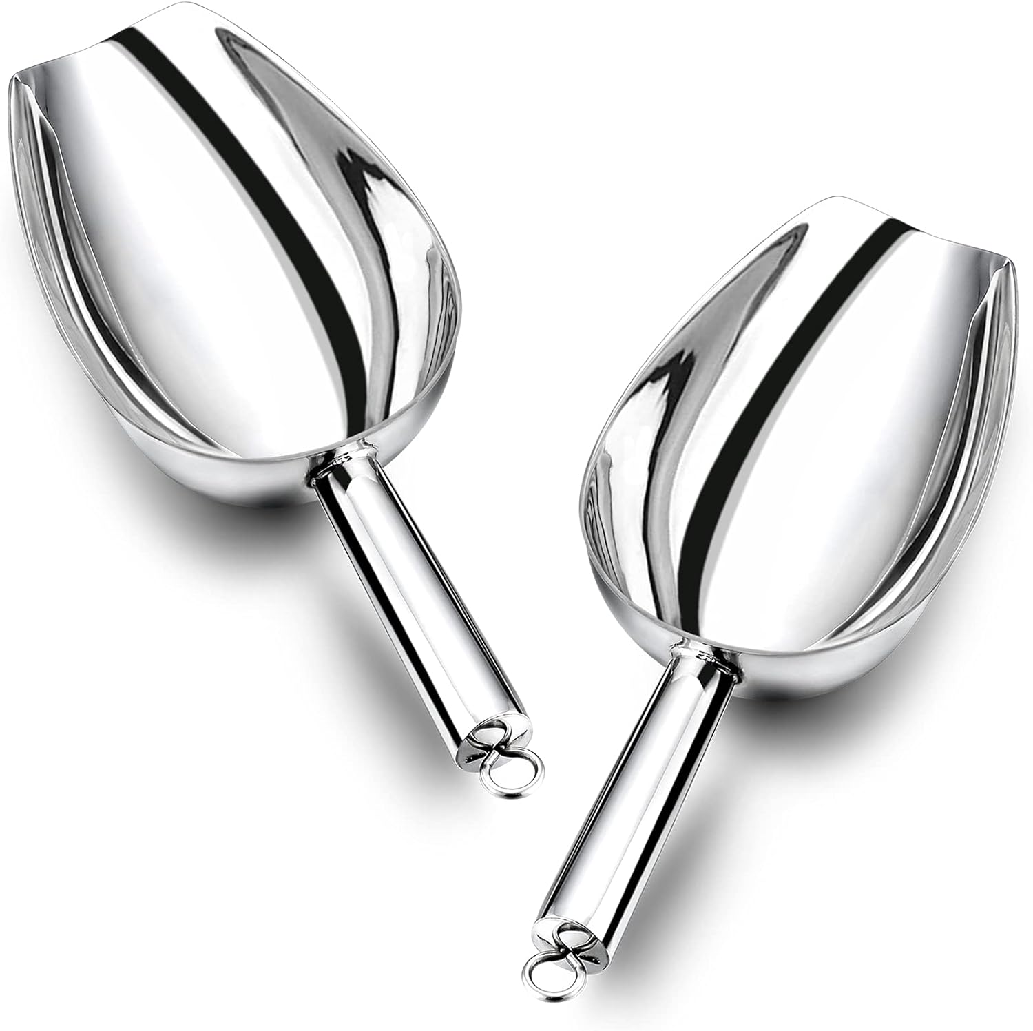 - 【8 OZ, 2 PIECES】Dimension: 9.3" L x 3.5" W x 2" H, 2-piece 8 Ounce Scoops would meet your any needs on kitchen, bar, and buffet, party and garden, they can easy to scoop ice cube, candy, popcorn, pet food and sand and soil, This scoop is lightweight and utility, Good gift for wedding and birthday