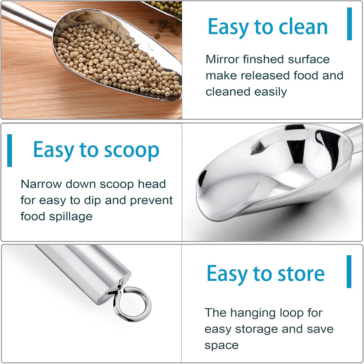 - 【COVENIENT USE】 Narrow down candy scoop head for easy to dip and hold more food without leaking, the hanging loop on the handle end for easy storage when not used and save space, They are perfect used in the freezer and Ice bucket because of rust resistance