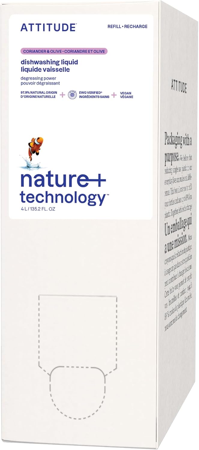 ATTITUDE Dish Soap Refill, EWG Verified, Plant-Based & Vegan Dishwashing Liquid, Naturally Derived, Olive & Coriander Scent, 135.3 Fl Oz