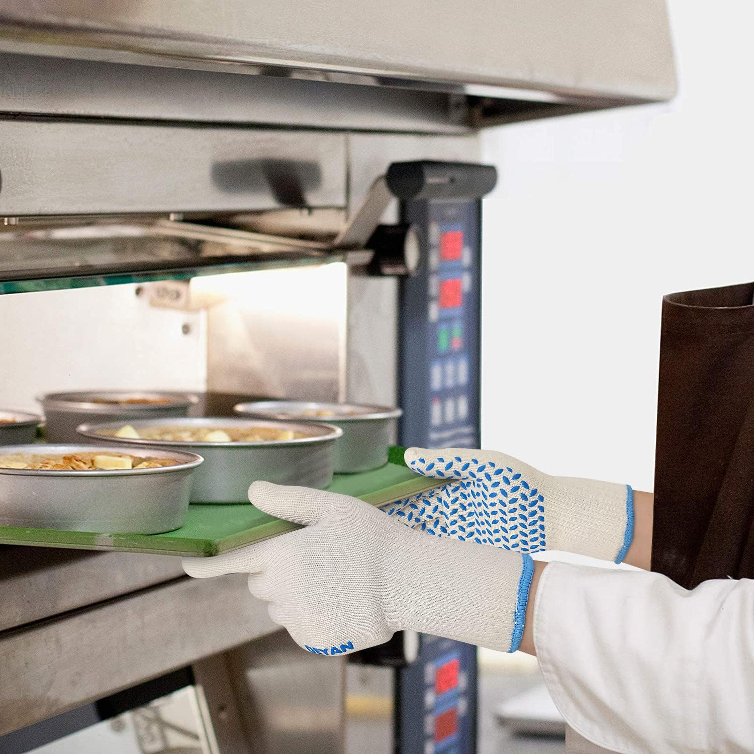 - PREMIUM QUALITY: Our oven gloves feature 3 layers of materials: a non-toxic silicone first layer for extra grip, an ultra-high strength aramid fiber second layer for heat resistance up to 932°F (500℃), and a comfortable and breathable polyester cotton third layer