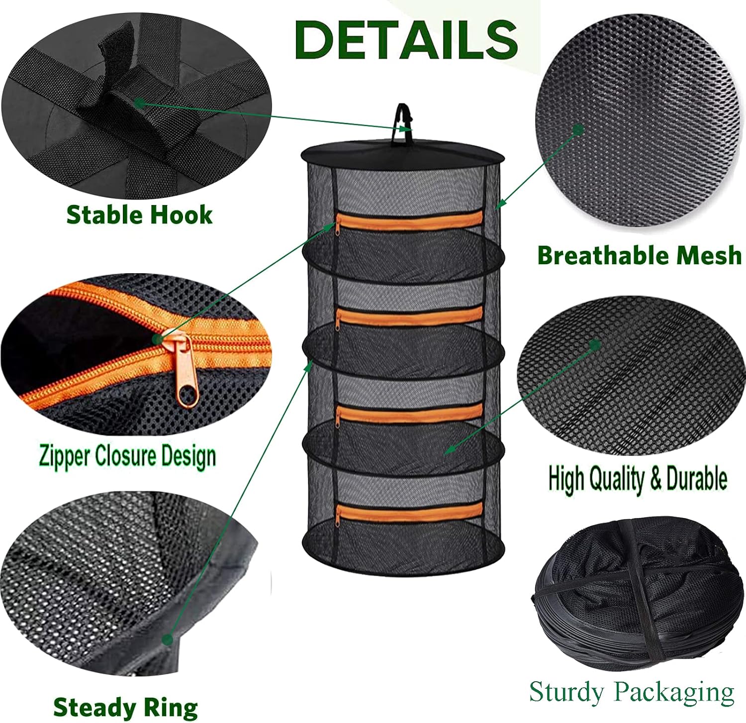 - 3.Enclosed Design:1/3 zipper lock-up the plant inside for drying, protect from the wind and other birds or fliers.You can place the hanging herbal drying rack anywhere. Outdoor, ceiling, growing tent, garage, closet , Wide-area, breathable, polyester mesh layers provide the perfect ventilation for quick drying, Can be used for herbs plants fish clothes nuts and etc.