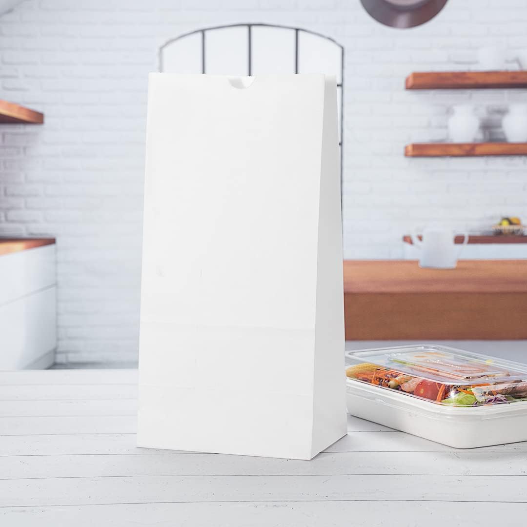 - INCLUDES 100 PAPER BAGS: Holds up to 8 pounds! Measuring 6 inches in length by 4 inches in width by 11.75 inches in height, these white bags can hold large snacks. Each order includes 100 paper bags.