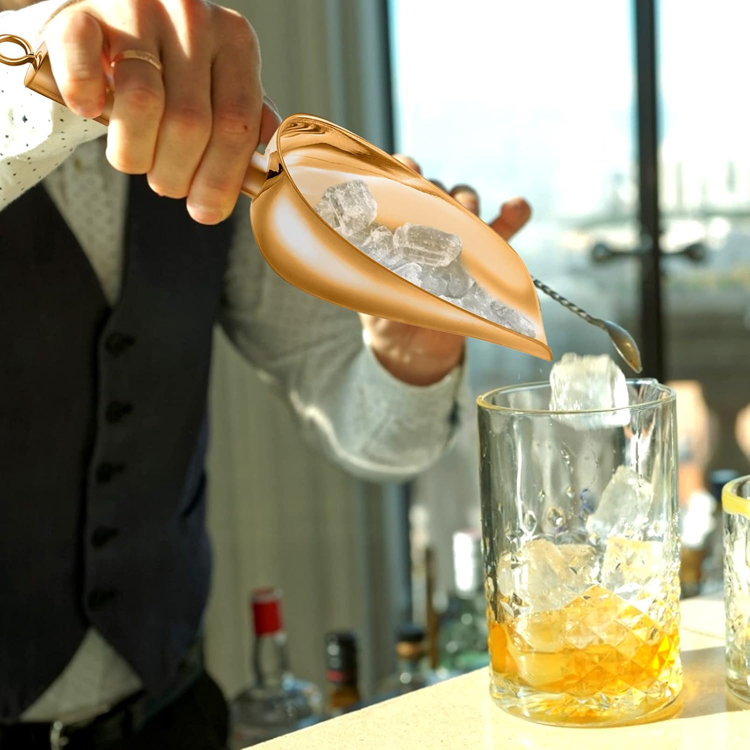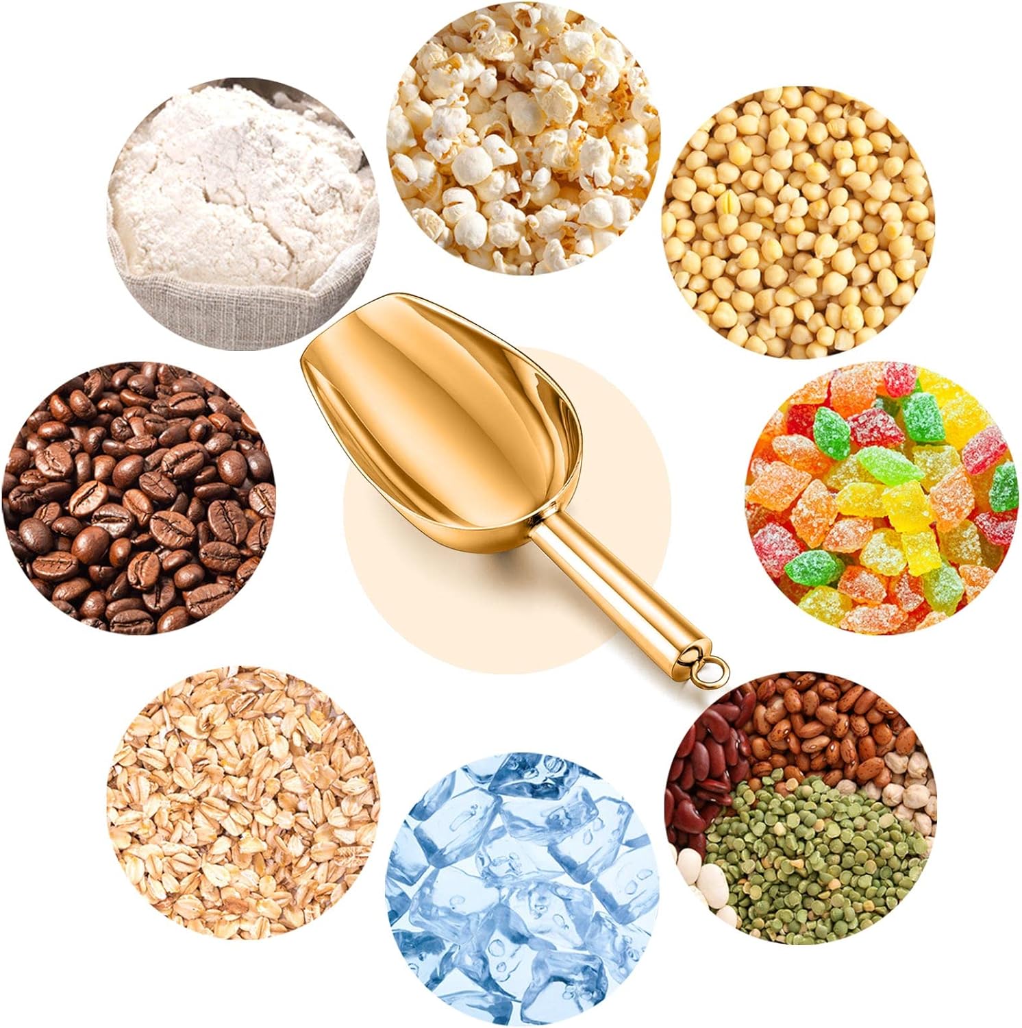- Multi-Purpose: 5oz metal ice scoop, Overall length 8 inch, Bowl 4.5’’ L x 2.7’’ W x 1.5’’ H, Compact size to scoop from small bins or containers, 2 pcs meet different uses to scoop ice cubes, coffee beans, grains and flour at the same time