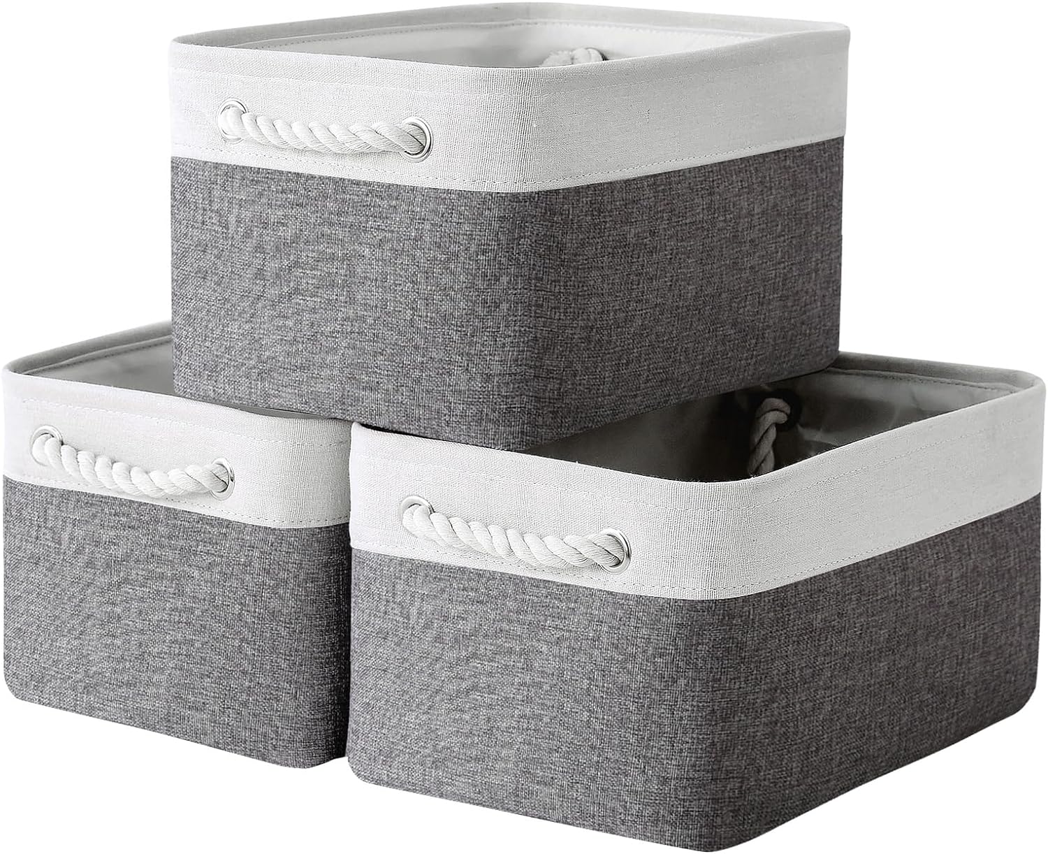 TcaFmac Collapsible Storage Bins for Organization - Large 3 Pack Canvas Storage Basket for Shelves, Organizer Baskets for Organizing for Closet Cloth Dog Toy Baby (White & Grey 16x12x8 inch)