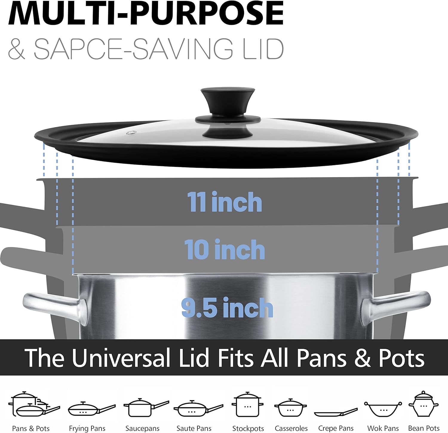 - EASY TO CLEAN AND STORE : The diameter 9.5" x 10" x 11" of the pot Lids is specially fits all your pots and pans. The Flat Glass Lid is easy for cleaning, without the tough scrubbing or cleaning, just throw it in the dishwasher, It is suitable for drawers, cupboards and dishwashers.