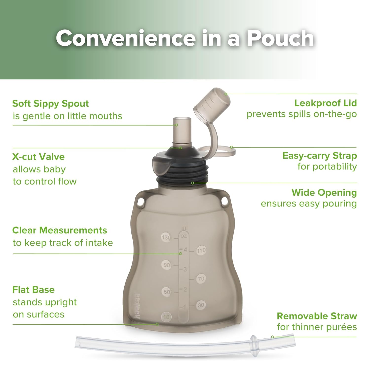 - ππππππππππ ππππ -π ππππππ:Each of these reusable pouches for toddlers and babies includes a variable flow opening for safe, self-paced feeding. Soft silicone spout is gentle on mouths, easing the transition to solids.