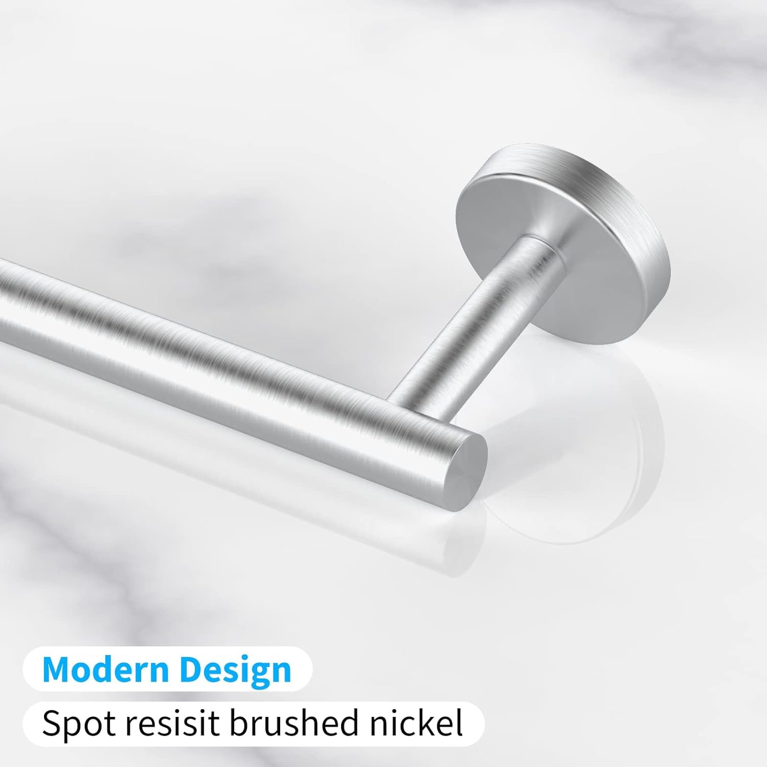 - 【Modern safety design】- This perfect towel bar set brushed nickel bathroom accessories have a simple and sturdy design, providing efficiency and style for daily use. the smooth edges protect your body from scratches. Make not any products idle and keep your bathroom clean and tidy!