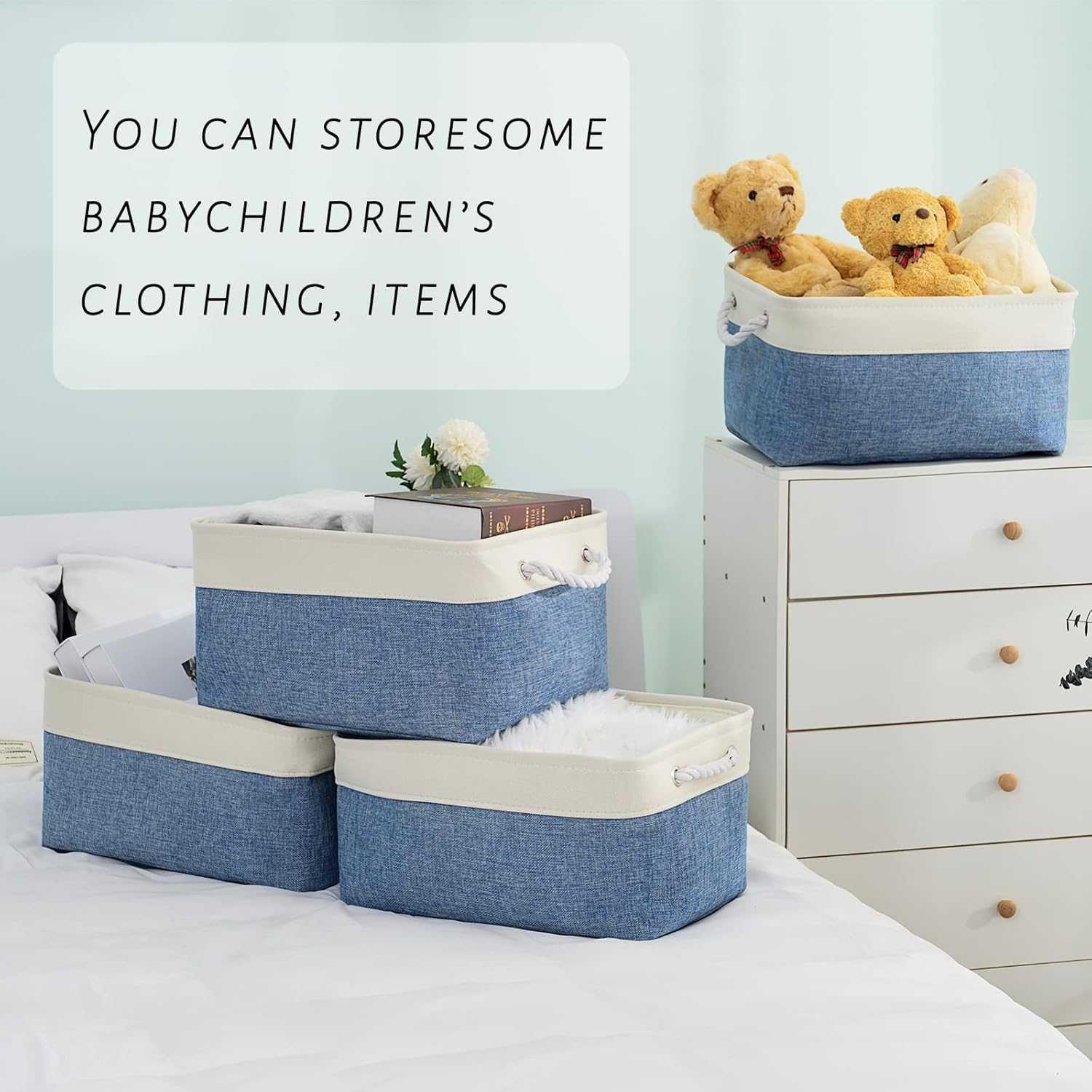 TcaFmac Storage Basket for Organizing - Large 4 Pack Fabric Storage Bins Baskets for Shelves with Ropes, Foldable Storage Cubes for Closet Cloth Toy (White & Blue16x12x8 inch)