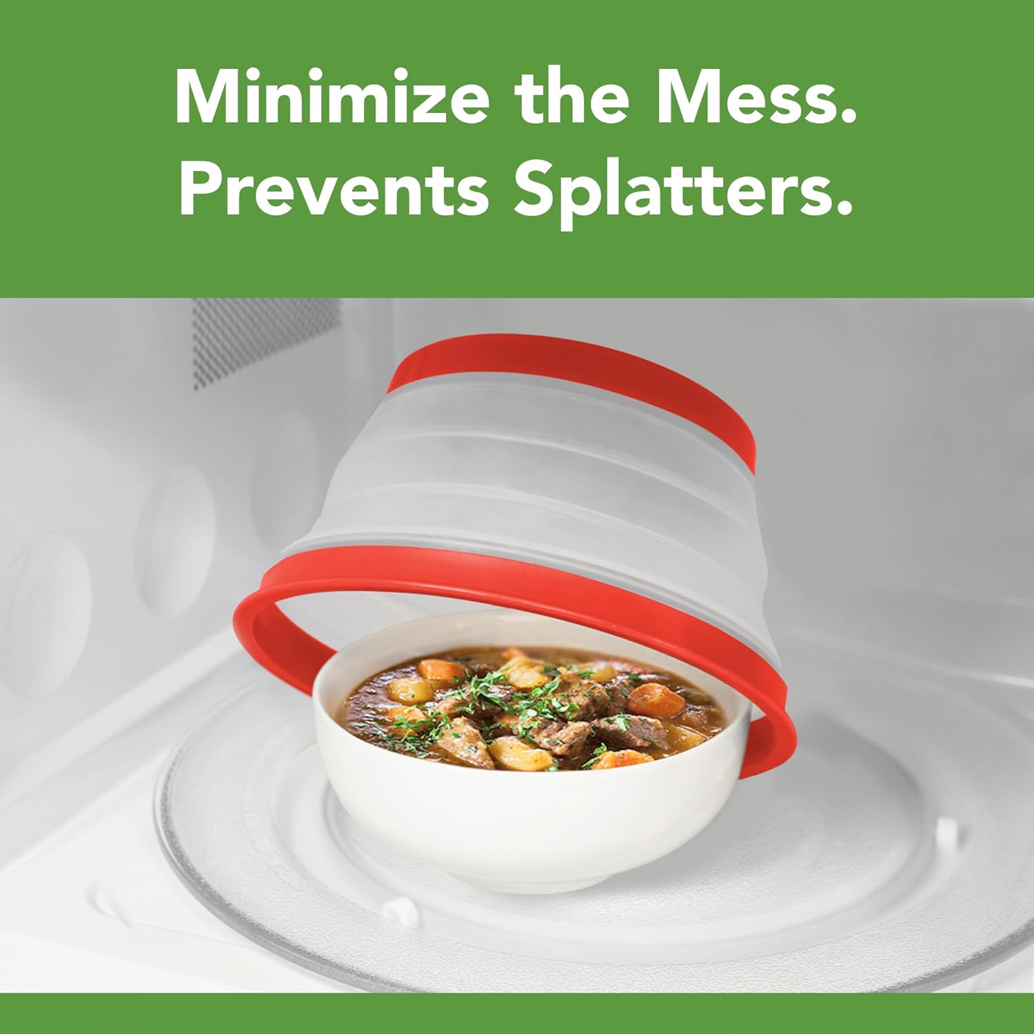 - Collapsible for Easy Storage: This collapsible cover pops up to 3" to cover tall dishes, piles of food, and shallow bowls. The cover collapses to 0.75" for easy storage. Cover can also be used flat to cover large bowls to prevent splattering.