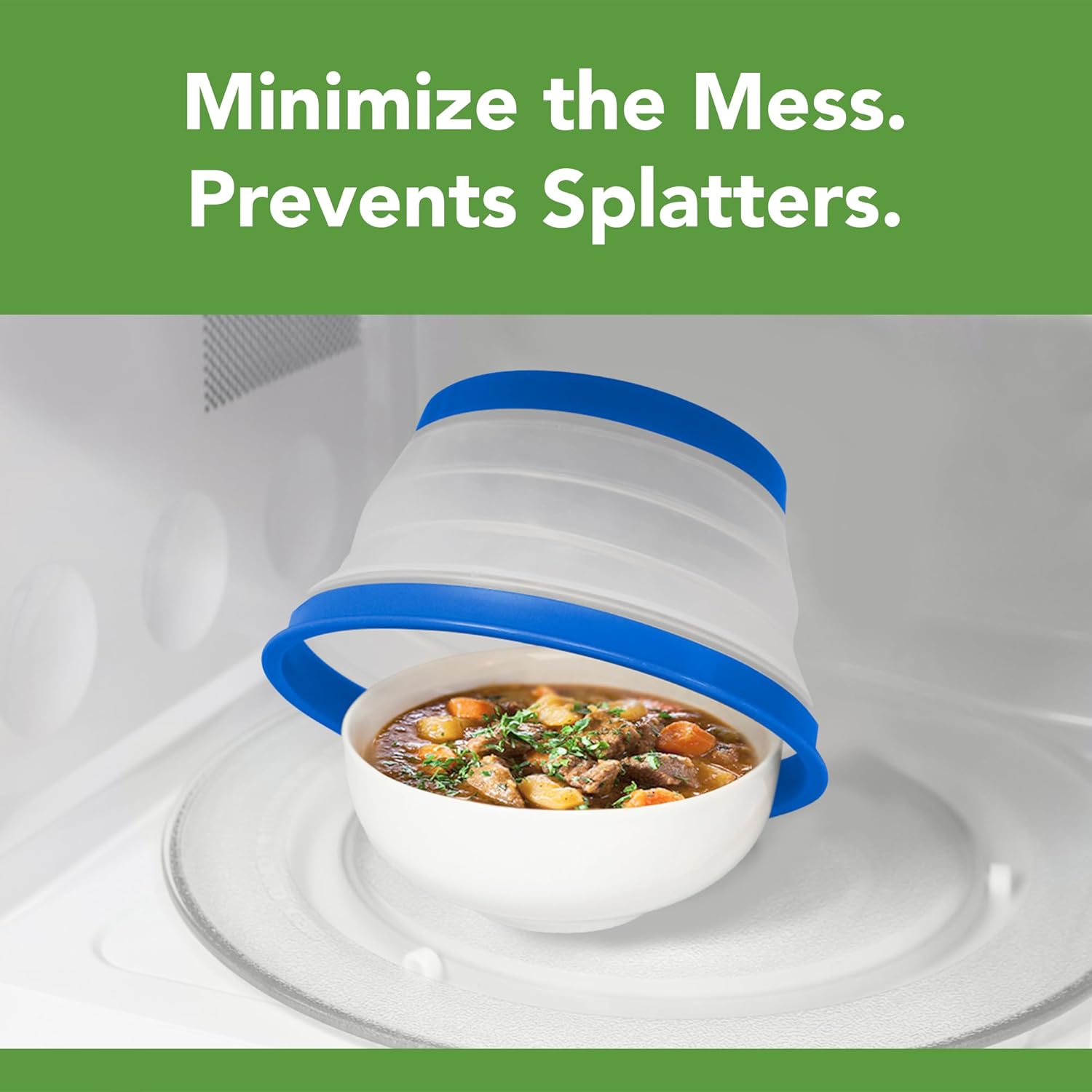 - Collapsible for Easy Storage: This collapsible cover pops up to 3" to cover tall dishes, piles of food, and shallow bowls. The cover collapses to 0.75" for easy storage. Cover can also be used flat to cover large bowls to prevent splattering.