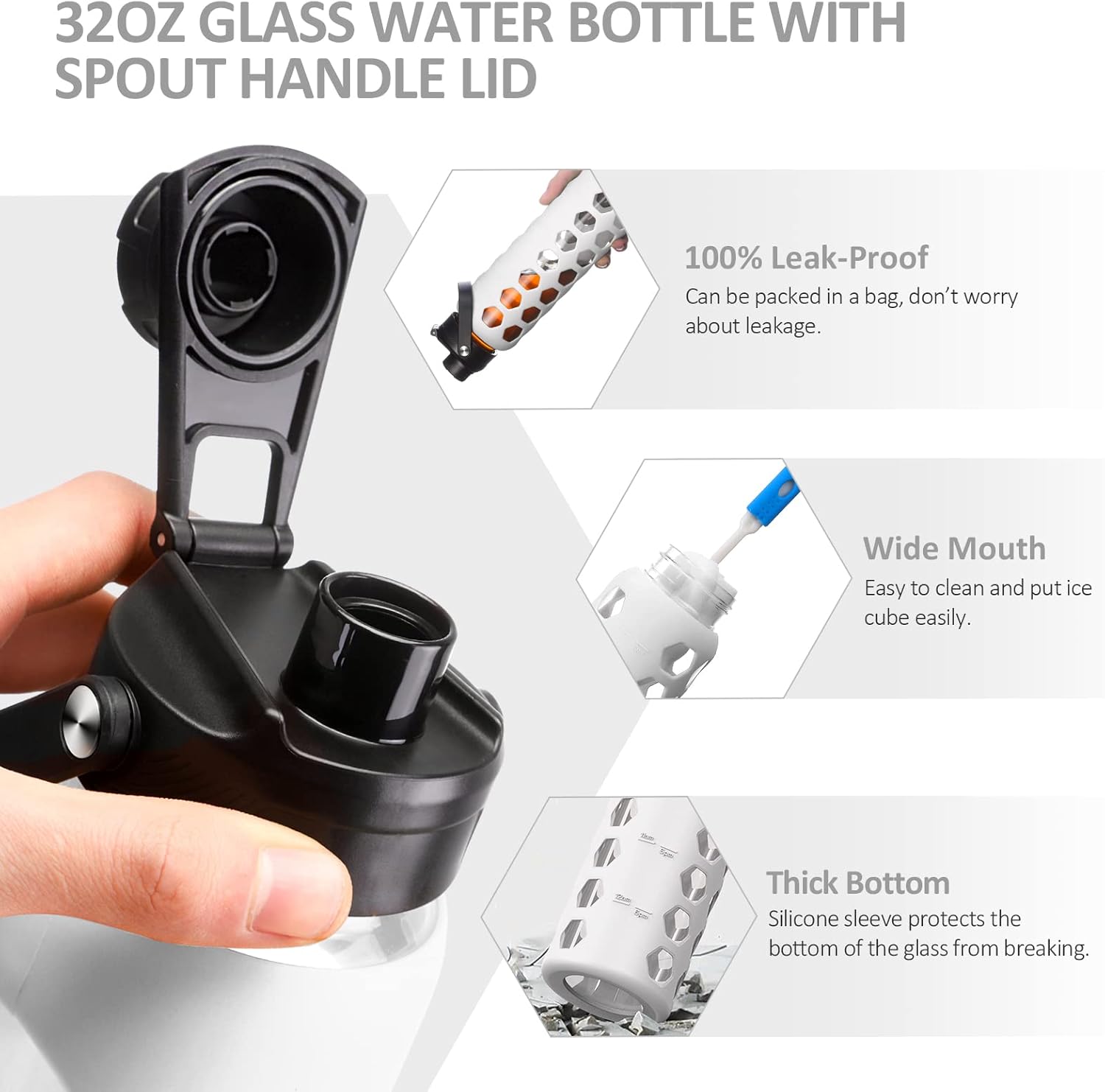 MUKOKO 32oz Glass Water Bottles with 2 Lids-Handle Spout Lid&Bamboo Straw Lid, Motivational Water Tumbler with Time Marker Reminder and Silicone Sleeve, Leakproof-White-1 Pack