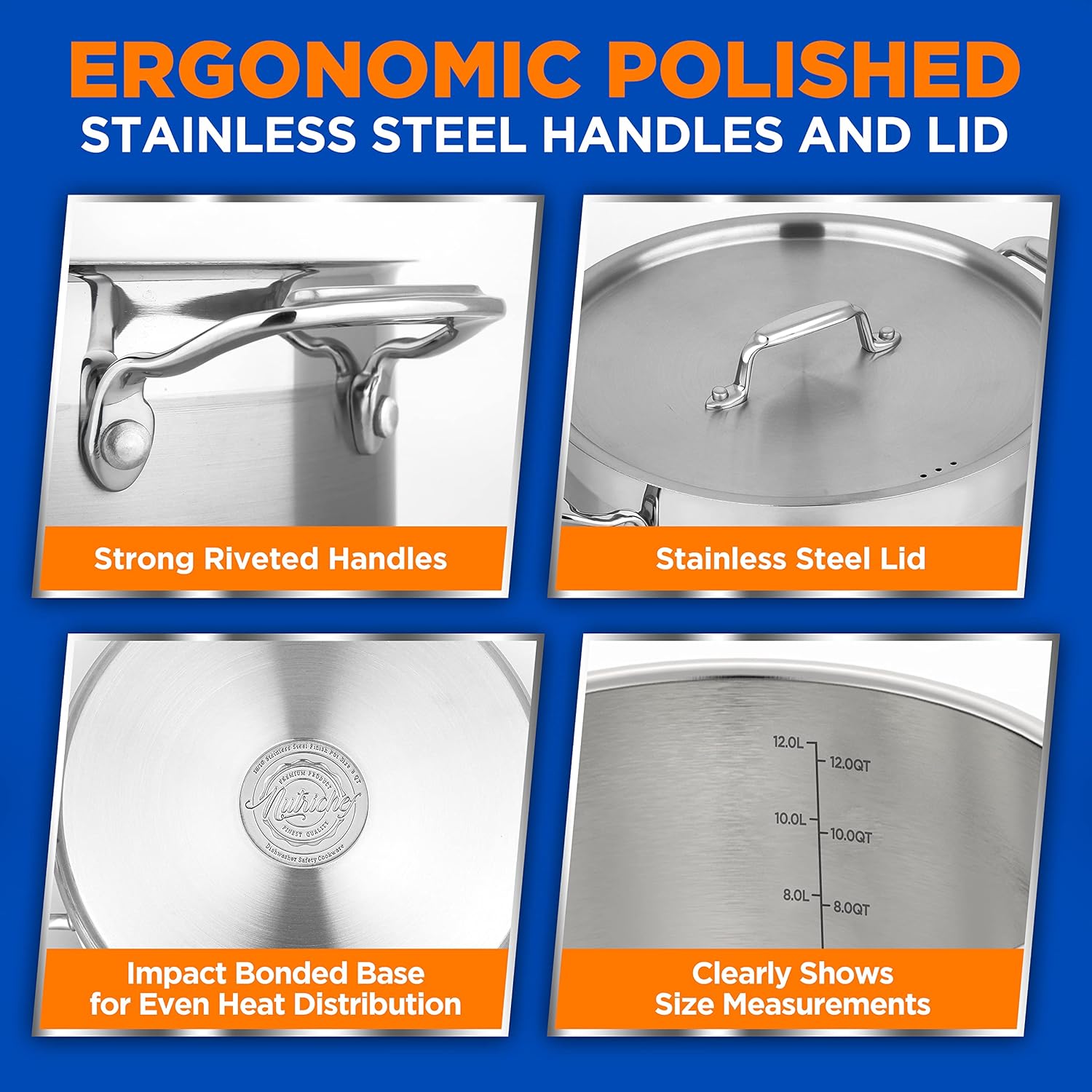 NutriChef 12-Quart Stainless Steel Stockpot with Stainless Steel Lid - 18/8 Food Grade Heavy Duty Large Stock Pot for Stew & Soup, Works w/Induction