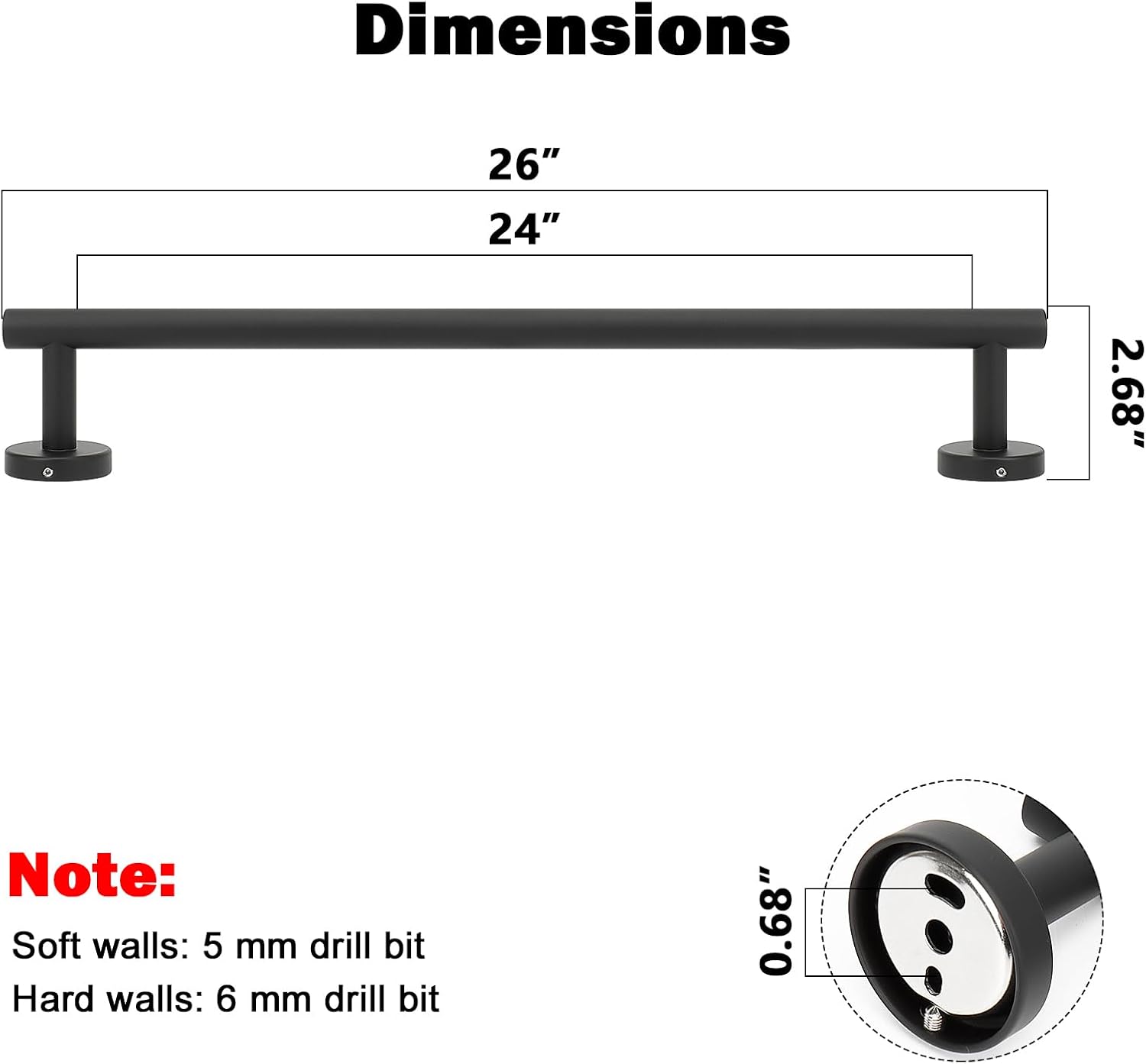 - DIMENSIONS & USE: Overall length is 26" (670mm). The length of hanging space is 24" (605mm). 22-Lbs (10kgs) max weight capacity. You can mount this towel bar to either side of your cabinet or closet door for storing at-use hand and dish towels. It can also be used with S hooks, hanging bath balls, hairdryers, teacups, spoons, clips, etc.