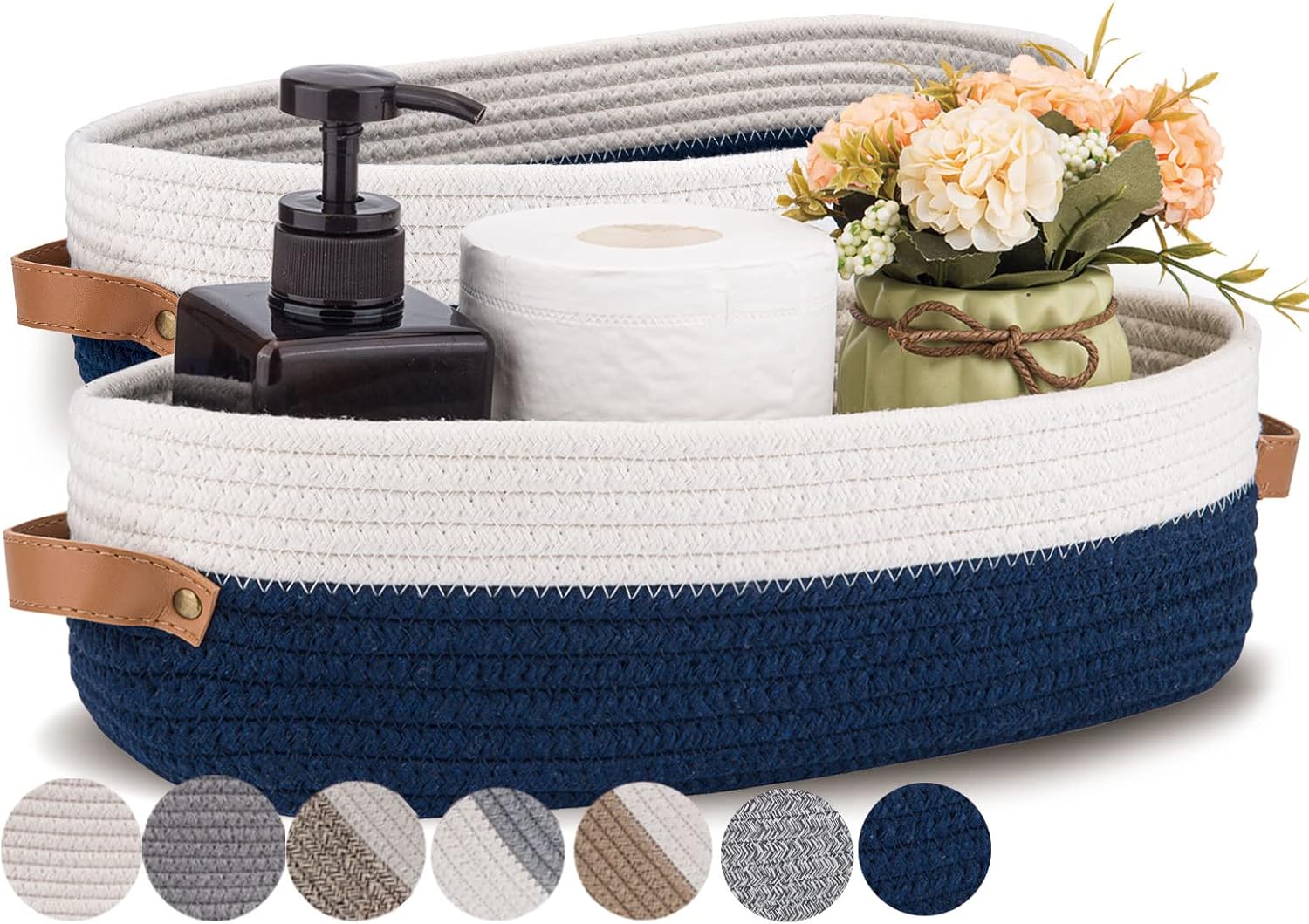 Set of 2 Toilet Basket,Woven Storage Basket for Toilet Tank Top Farmhouse Home Decor Organizing Baskets 13"x5.9"x4" Navy Stitching White