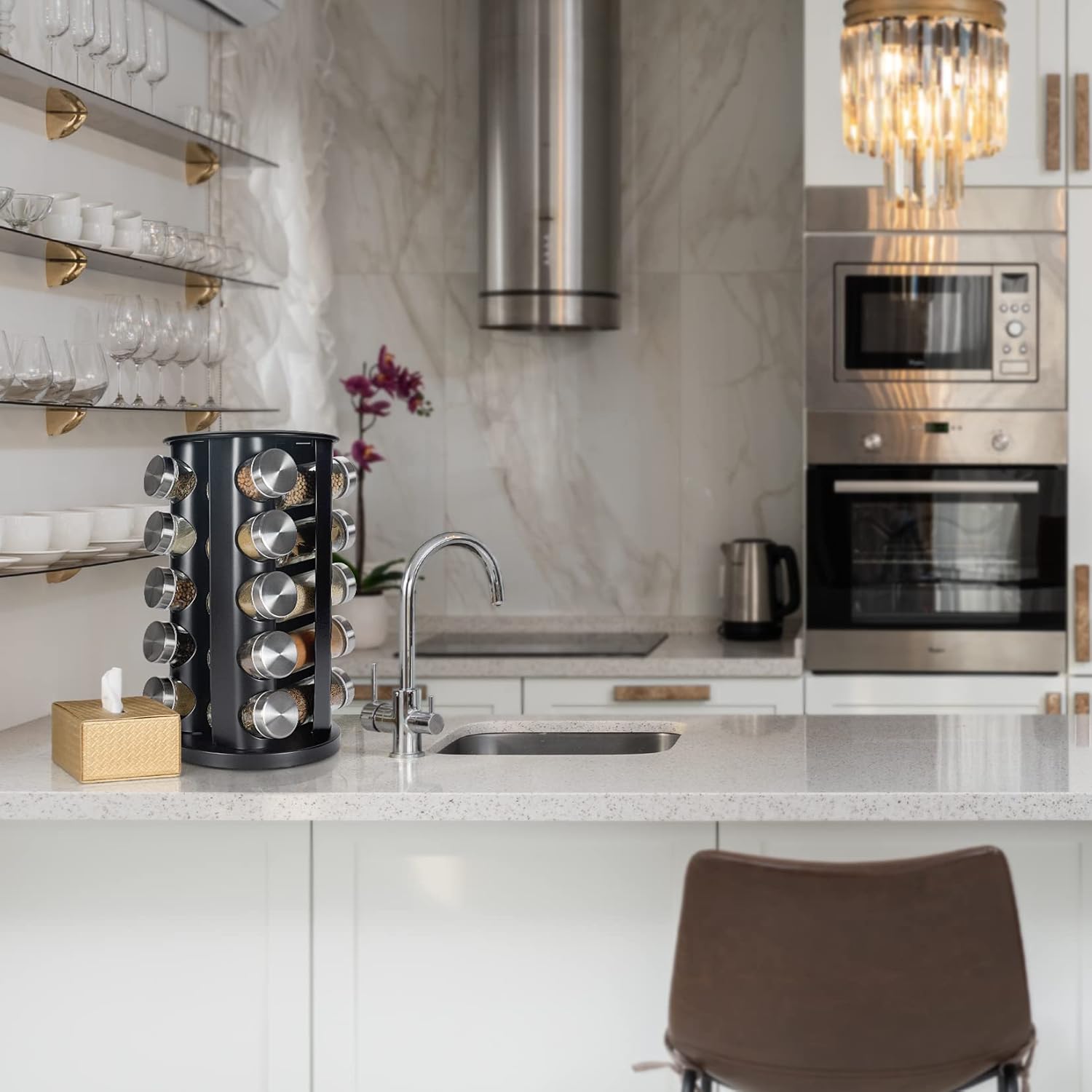 - PERFECT FOR YOUR KITCHEN AND DECORATION - The spice rack can be used in homes, restaurants and party buffets to enhance the ease of use and practicality of meals. The unique exterior design is also very eye-catching, no need to hide in the cabinet, no matter what your interior style, the spice organizer is a great decoration accessory for your kitchen. It is also a great gift idea.