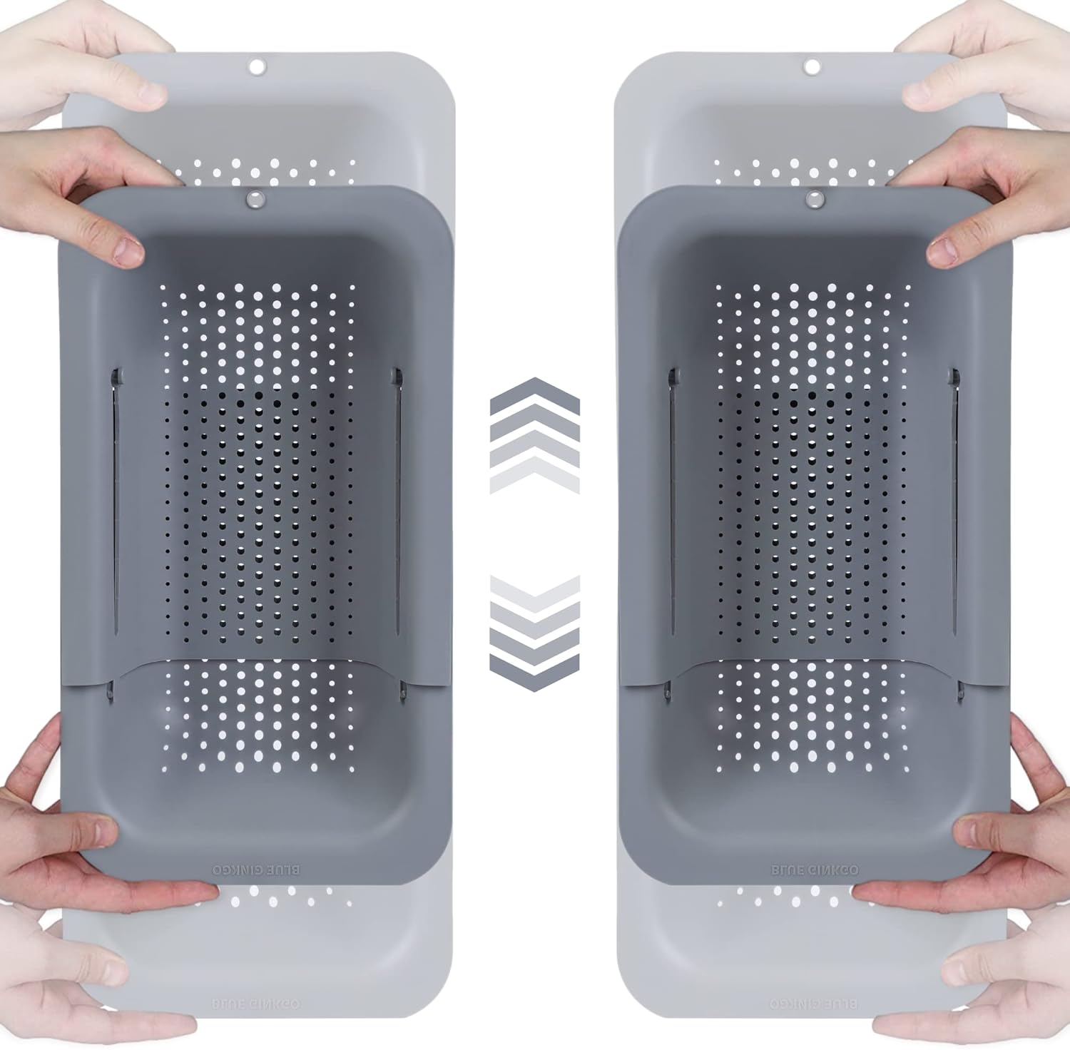 BLUE GINKGO Sink Colander Baskets - (Pack of 2) Wash Vegetables and Fruits, Drain Cooked Pasta and Dry Dishes - Extendable - New Home Kitchen Essentials (2 Grey)