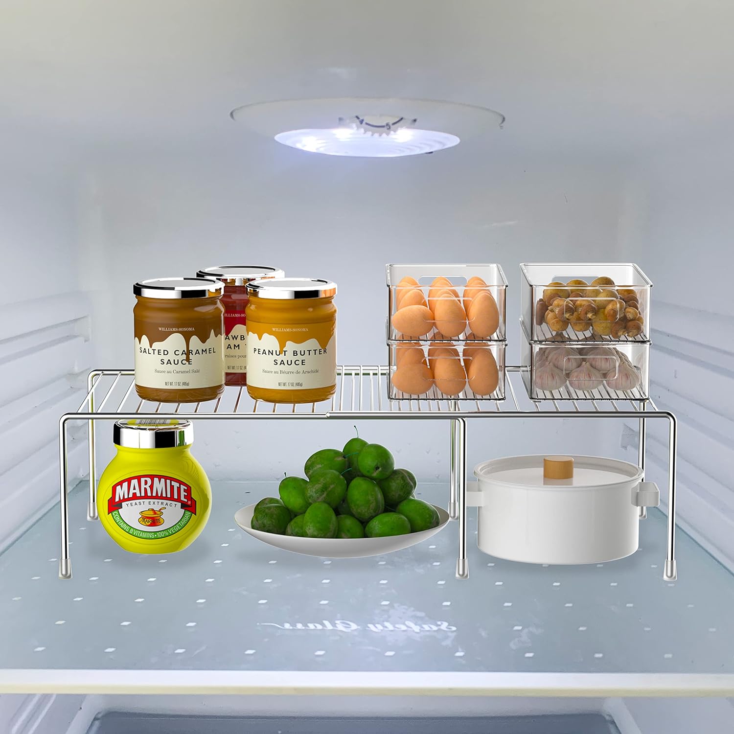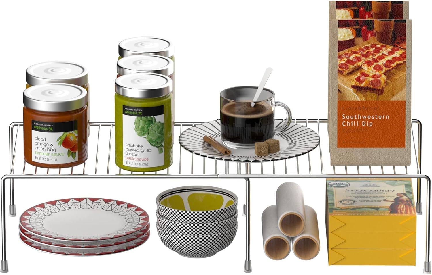 Redrubbit Cabinet Storage Shelf Rack, 4 Piece Expandable Metal Rustproof Kitchen Counter and Cabinet Shelf, Storage Rack Organizer Space Saver for Kitchen, Fridge, Cabinet, Bathroom, Chrome, Set of 2