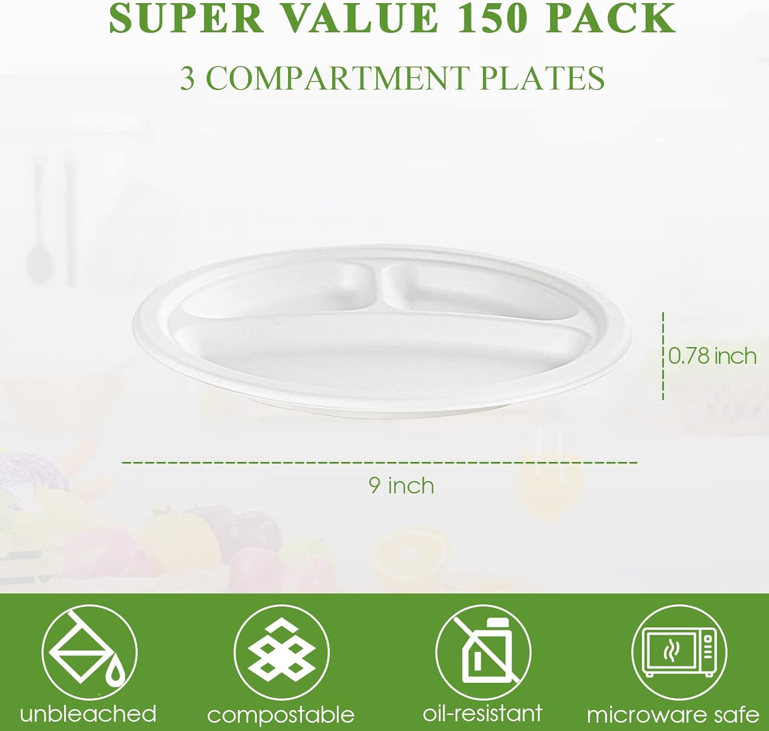 - Good For Environment: Made from sustainably sourced sugarcane fibers, these 9-inch 3 compartment plates are 100% biodegradable and backyard compostable, making these paper plates good for the environment