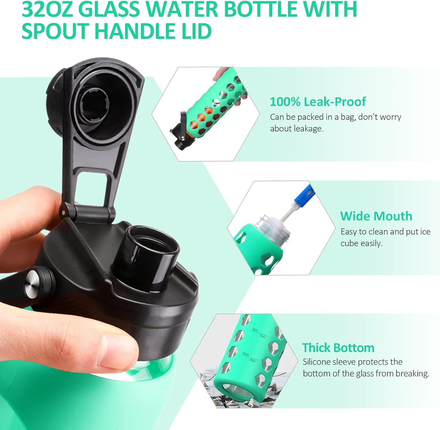 MUKOKO 24oz Glass Water Bottle with 2 Lids-Handle Flip Lid&Bamboo Straw Lid,Motivational Water Tumbler with Time Marker Reminder and Silicone Sleeve, Leakproof-Green
