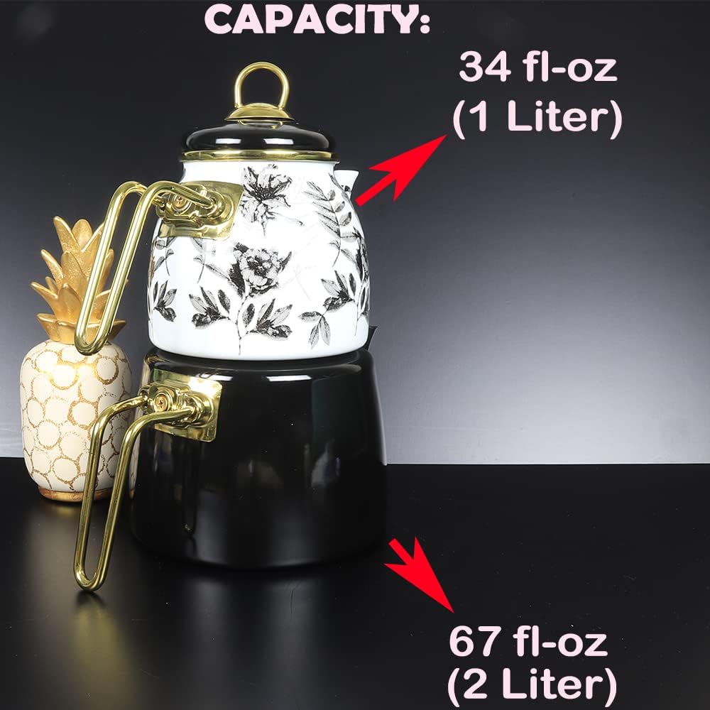 Vintage Turkish Teapot Tea Pots Kettle Set for Stovetop Stove Top Decorative Infuser Party Cups Glasses Floral Unique Boiler Samovar Strainer Loose Leaf Kitchen Style Enamel Decor (White-Black)