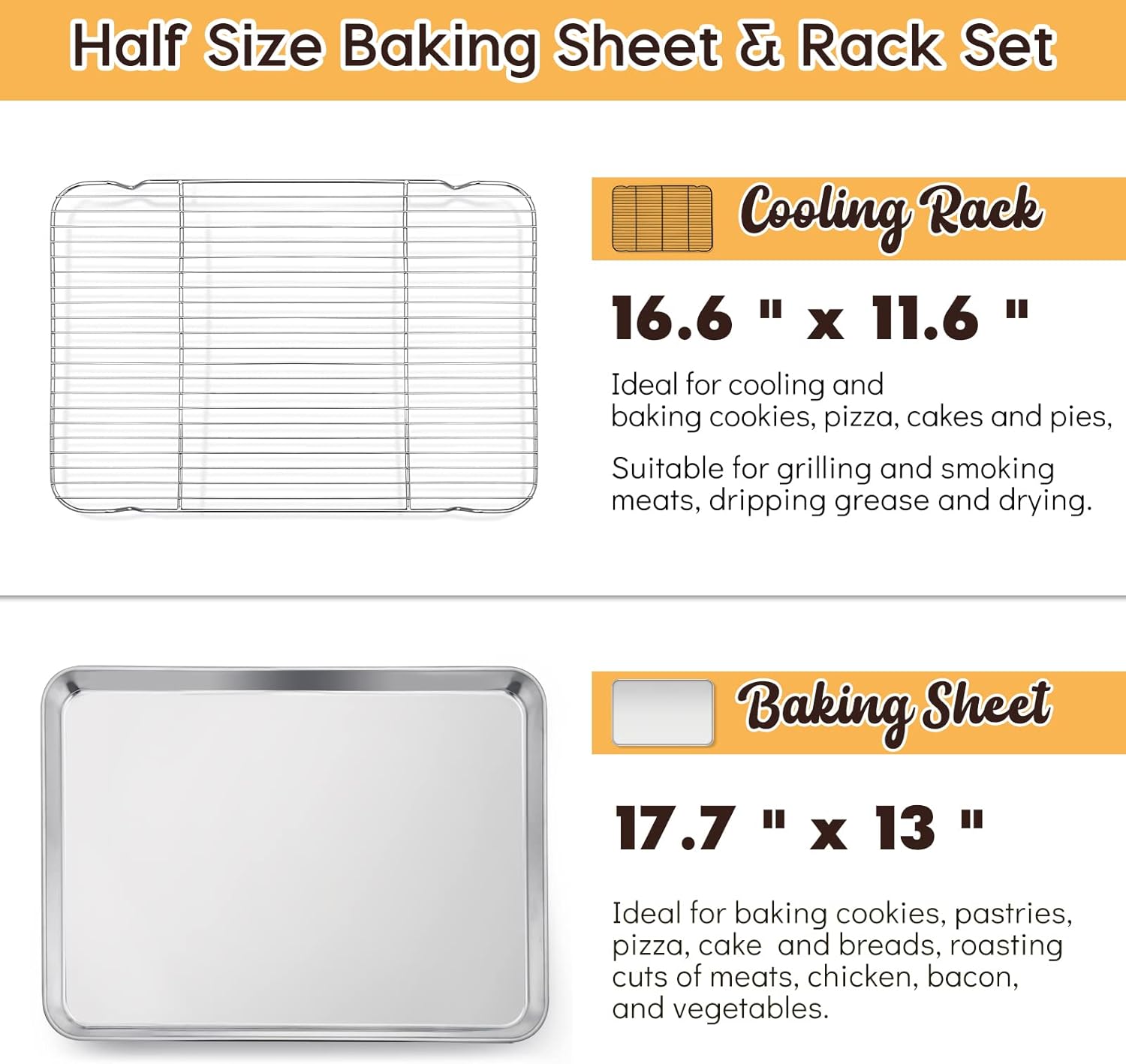 - HALF-SHEET SIZE - Including 1 cookie sheet 17.7 x 13 x 1 inch and 1 cooling rack 16.6 x 11.6 x 0.6 inch, Fits most home ovens, Work perfectly together and also can be used separately, Ideal for everything from baking and cooling cookies, pizzas, and breads to roasting cuts of meats, bacon and vegetables
