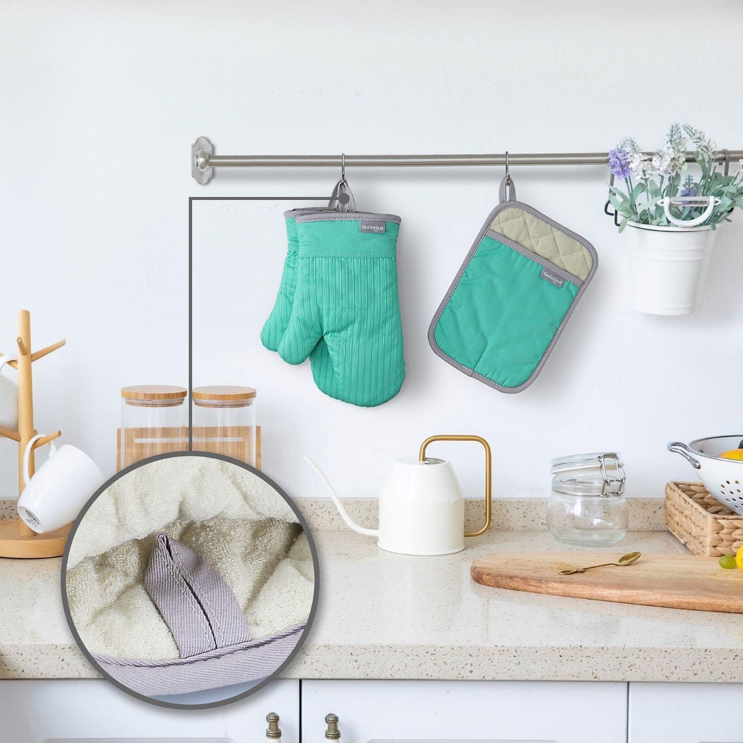 - COMPLETE 4-PIECE KITCHEN PROTECTION SET: This ultimate kitchen set includes 2 oven mitts and 2 pocket-style pot holders, offering full coverage to safely handle hot cookware, baking sheets, and pans straight from the oven or grill. Everything you need in one convenient package