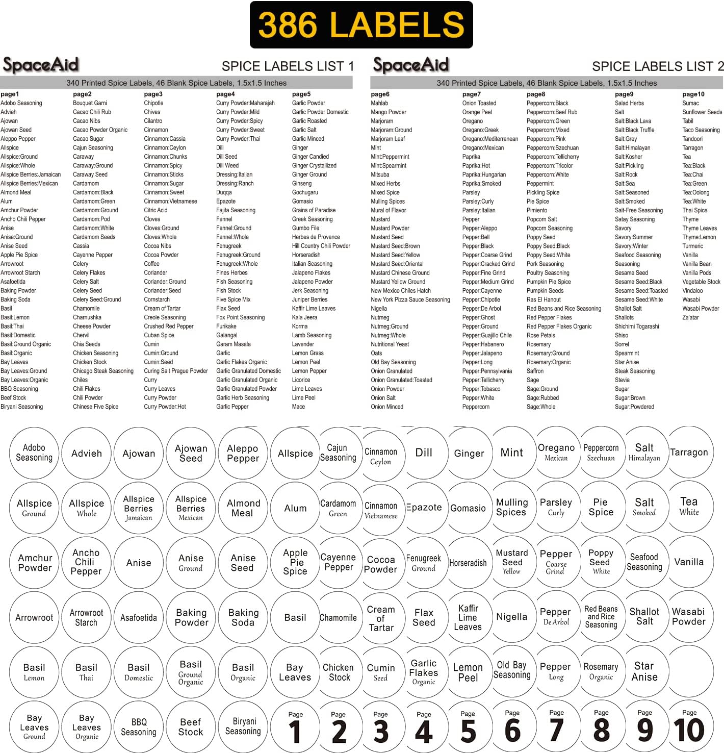- 386 Waterproof Spice Labels - Made of waterproof and tear-resistant material to be removed and repositioned; 340 preprinted Spice labels cover both common and exotic spices, 46 blank labels with 1 chalk marker for writing on labels and can be wiped and rewritten; In case you cannot find the labels you want, the numbered catalog will help you