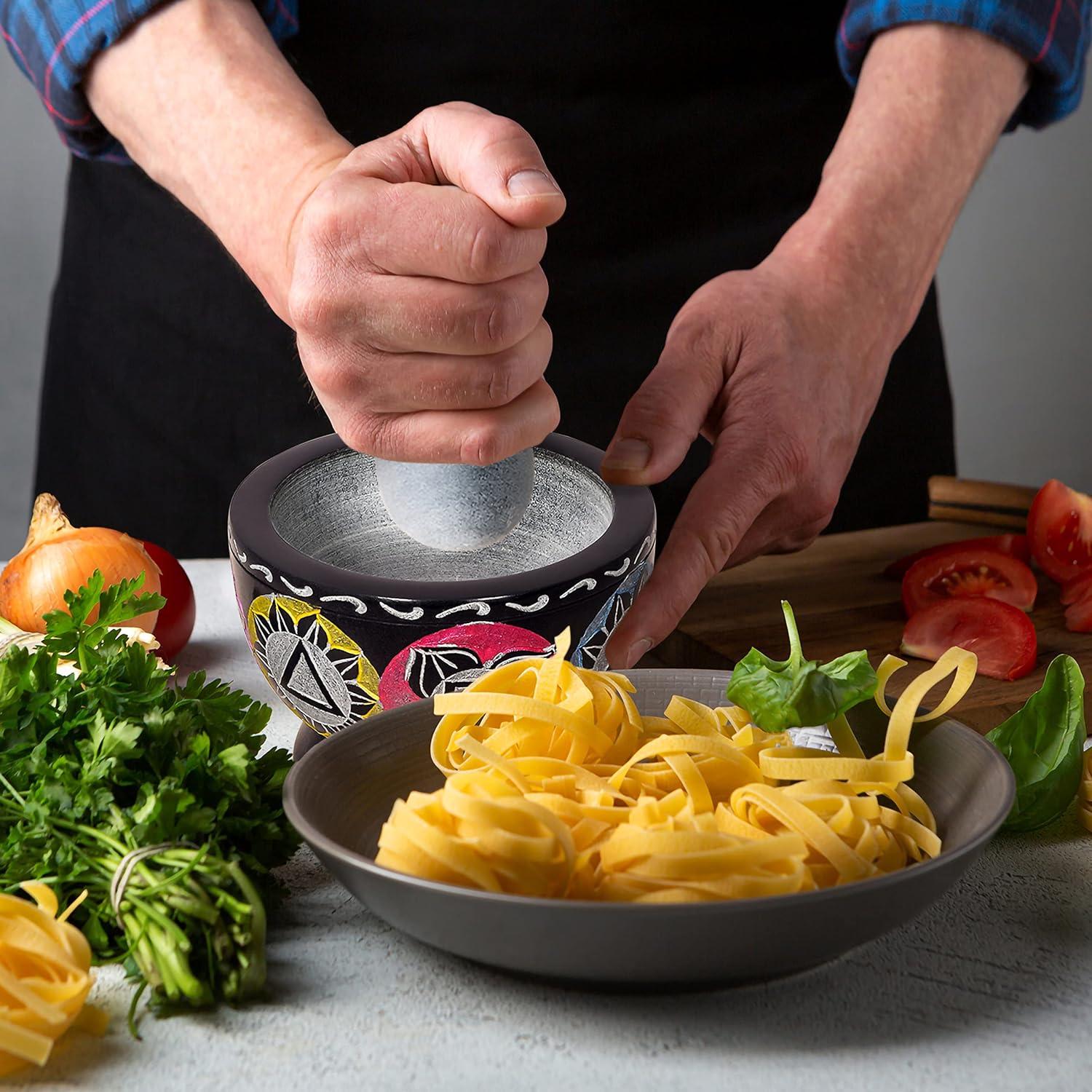 - THE PERFECT BLEND OF FORM AND FUNCTION! - The mortar and pestle have been used for centuries as the perfect way to grind and mix ingredients. This stunning black mortar pestle adorned with intricate designs in vibrant colors is a must-have for any kitchen.