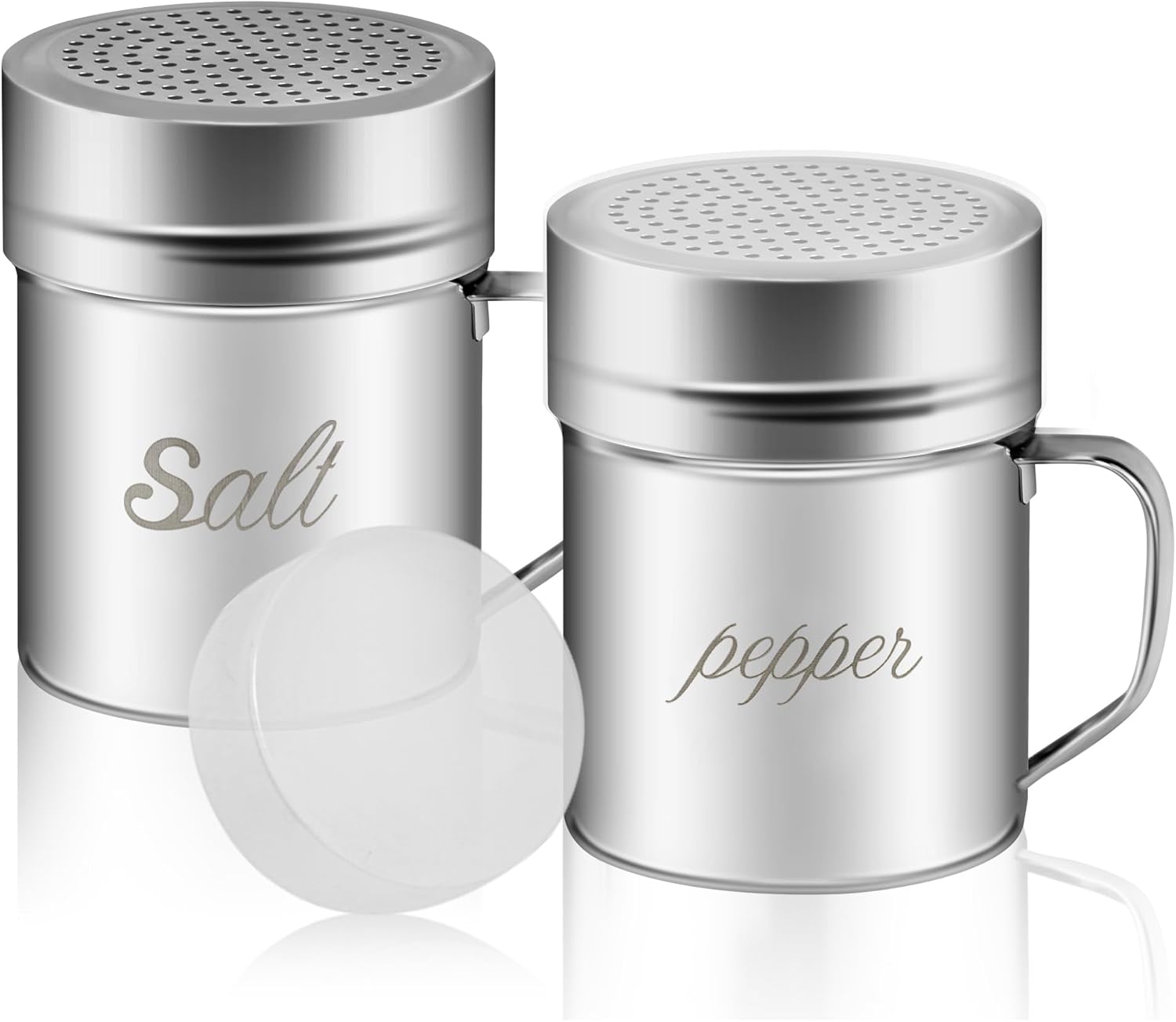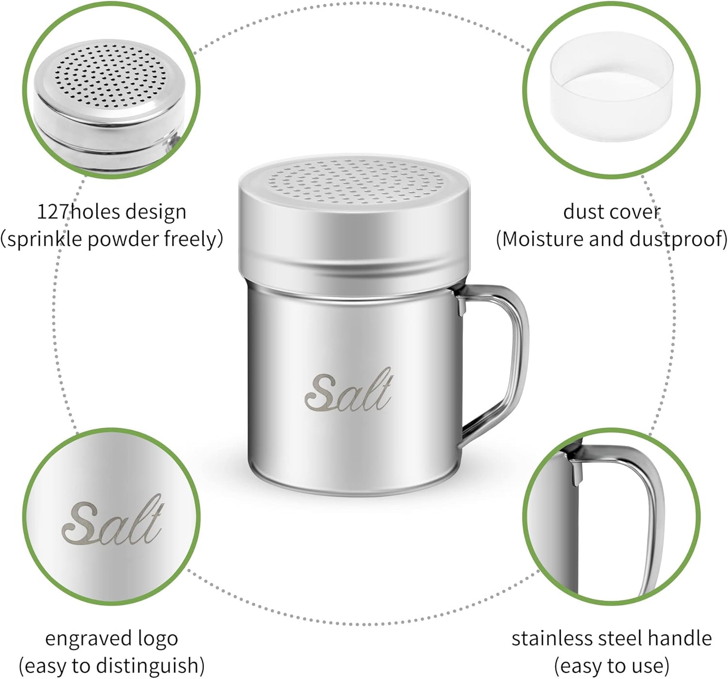 Stainless Steel Salt and Pepper Shakers Set, 10 OZ Seasoning Spice Shaker with Lid and Handle 127 Holes, Metal Dredge Shaker for Powder Sugar Cooking Kitchen Baking (2 Pieces)