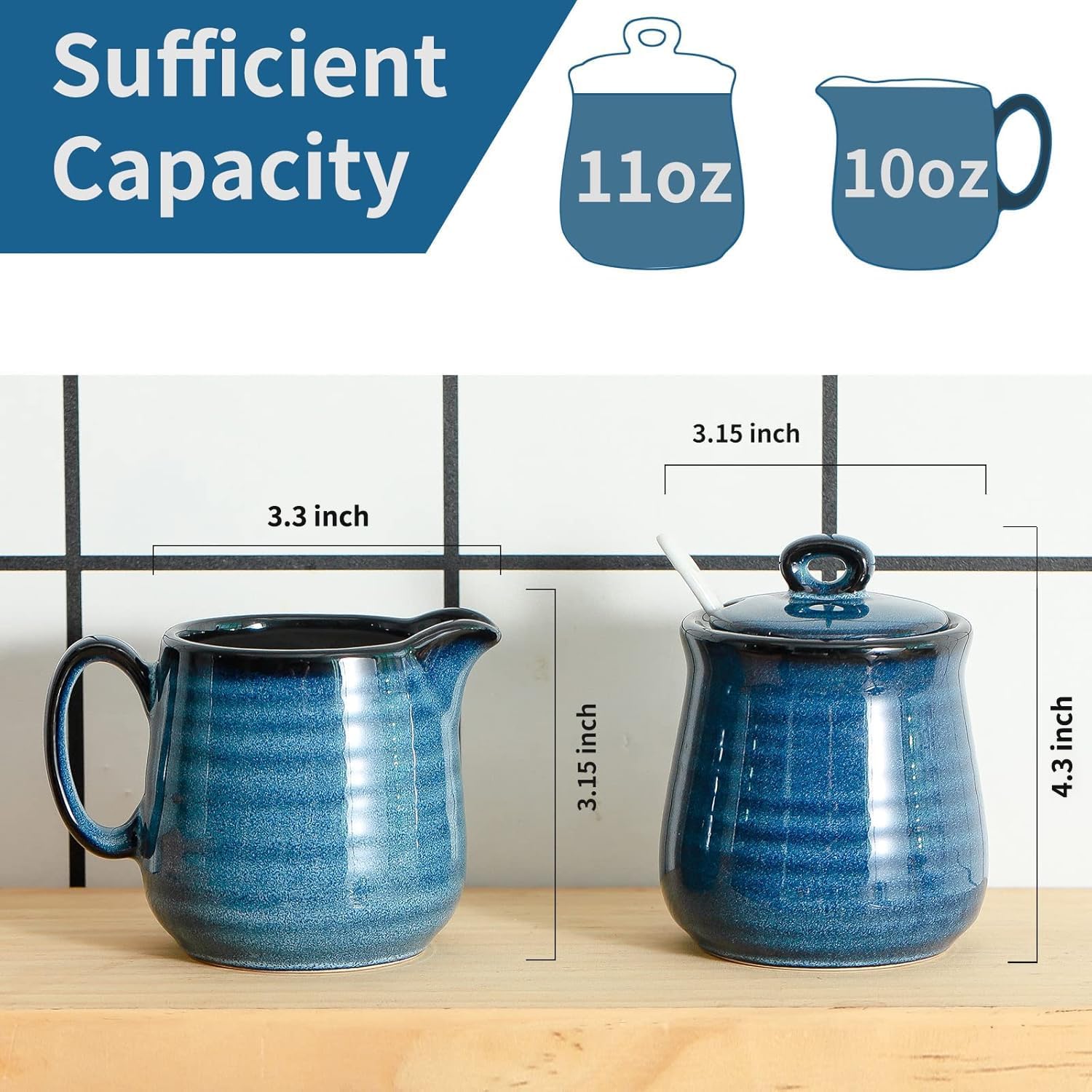 - Reasonable Size: The size of the cream and sugar set is perfect. We have gone through a lot of research and practice to design the most suitable size for consumers' daily life, the size of the sugar bowl is 11oz and the size of the creamer pitcher is 10oz to avoid the food being stored for too long to affect the health.