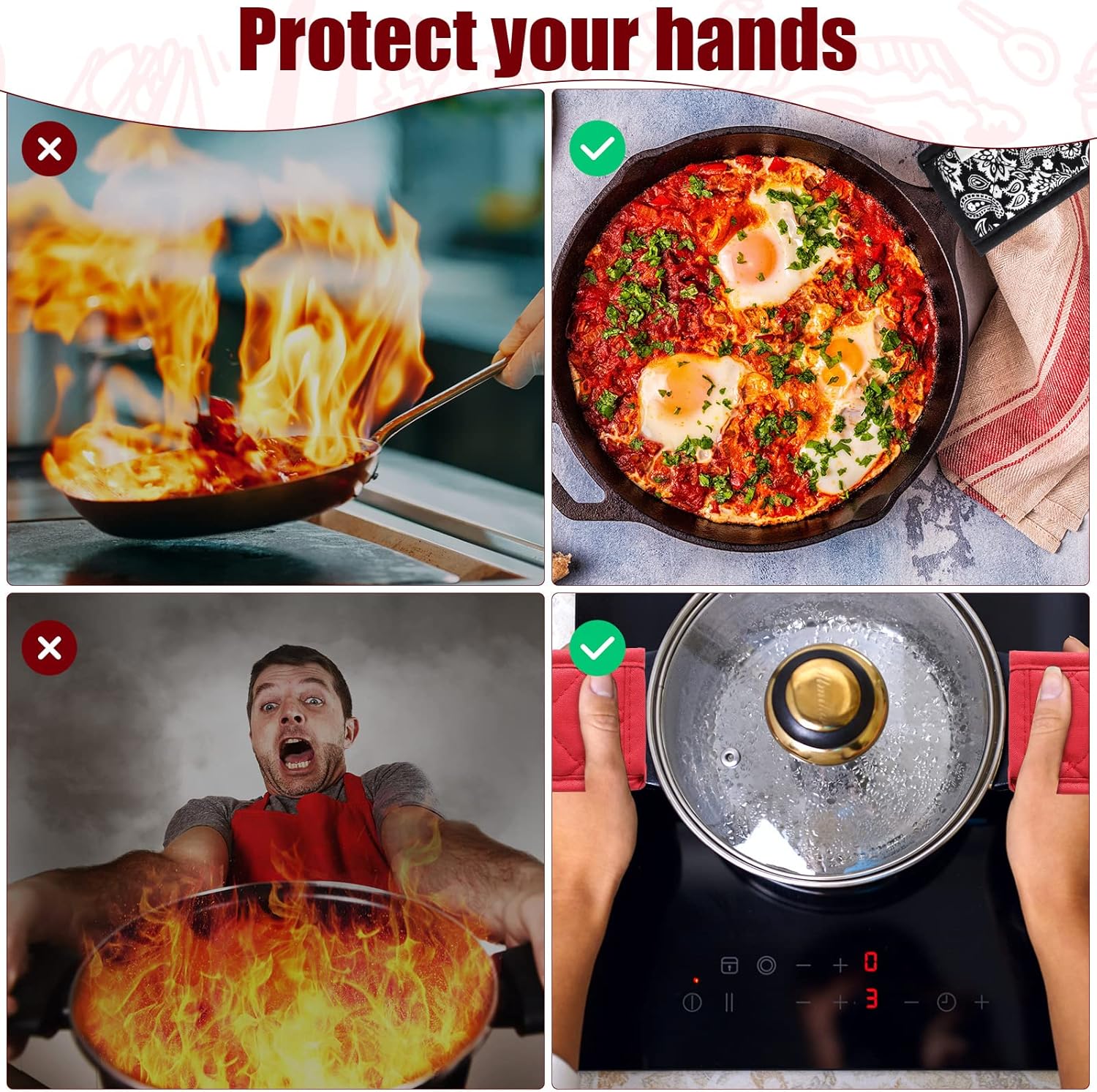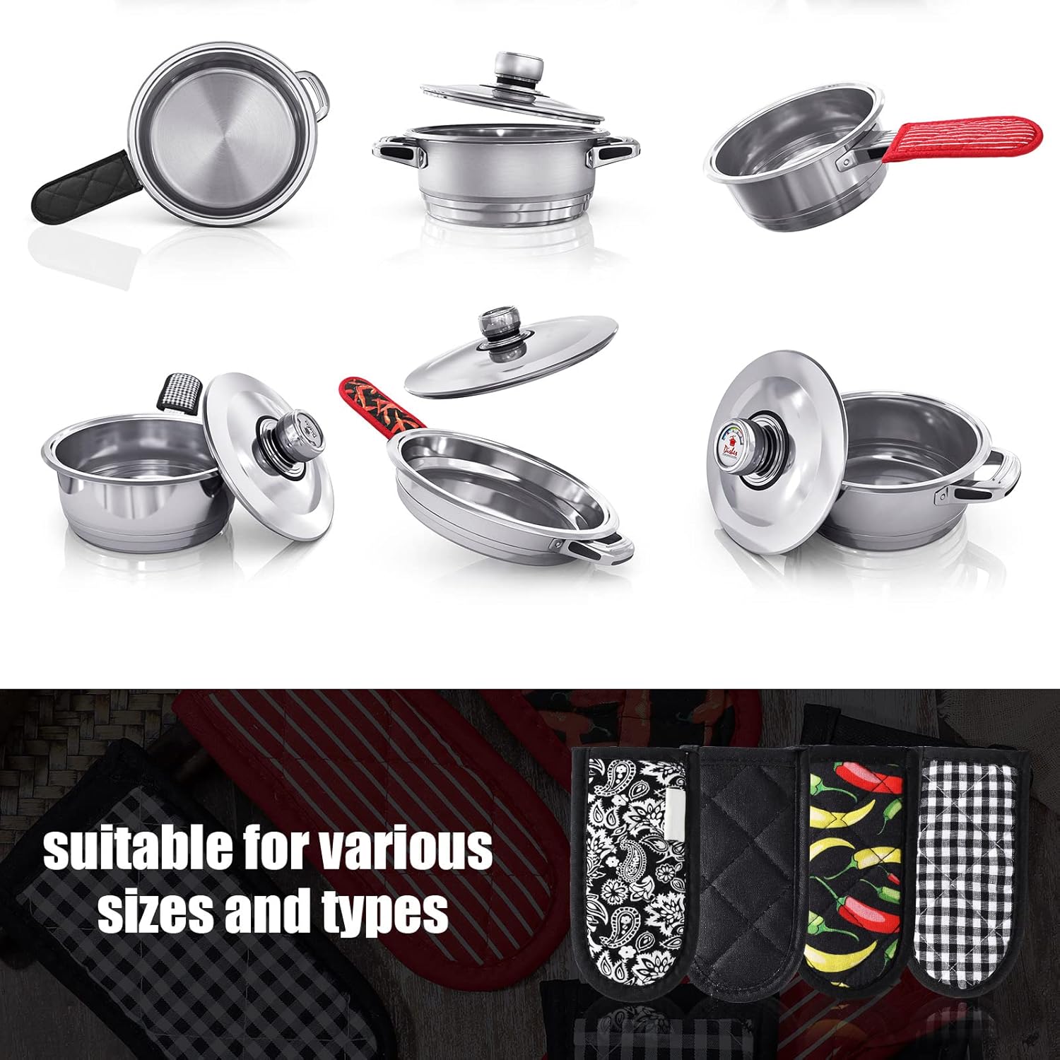 - Sufficient styles set: 4 styles of these non-slip pot sleeve grips for you to choose, include solid black color, black and white buffalo plaid, red base color with white stripe, black base with red pepper design, you can choose the styles you want to add touch to the kitchen cookware