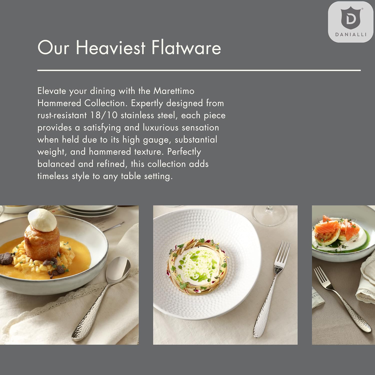 - The heaviest in DANIALLI's collection: Crafted with a hammered texture and heavy 18/10 stainless steel, each piece offers a solid well-balanced grip you’ll notice the moment you hold it.
