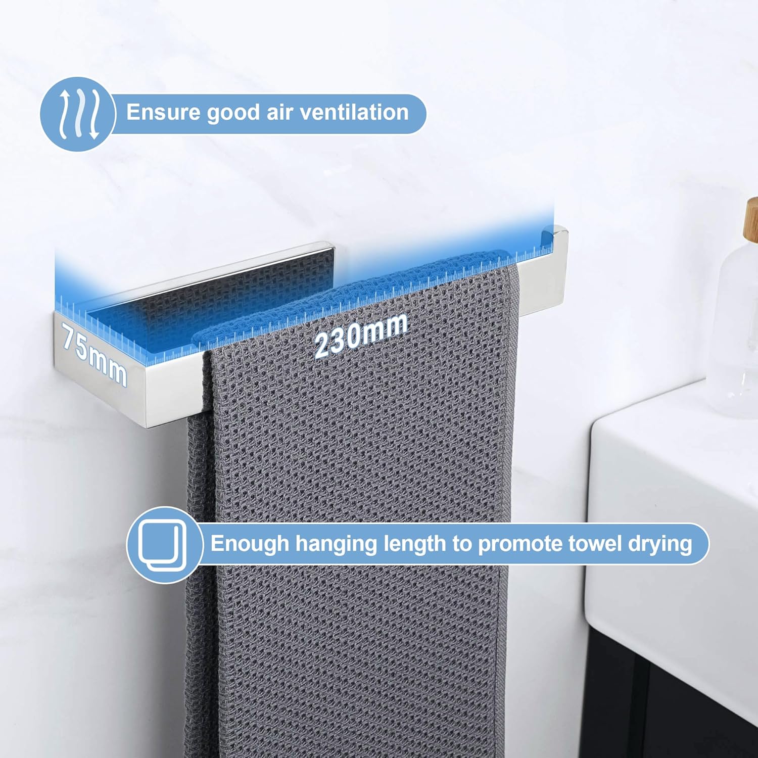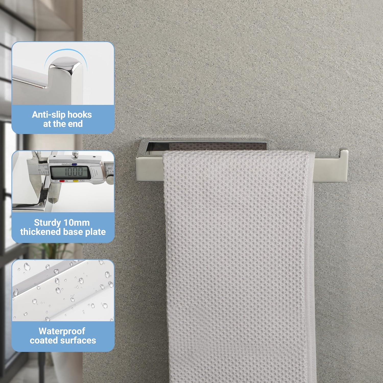 - 10 INCH TOWEL BAR - The overall length of the hand towel bar for bathroom is 9.45". The length of hanging space is 8.6" and the maximum load is 17.6 lbs. 2.18 inches apart from the wall for quick and thorough air drying. Perfect for bathroom, kitchen, laundry room, cabinets, wash basins, etc.