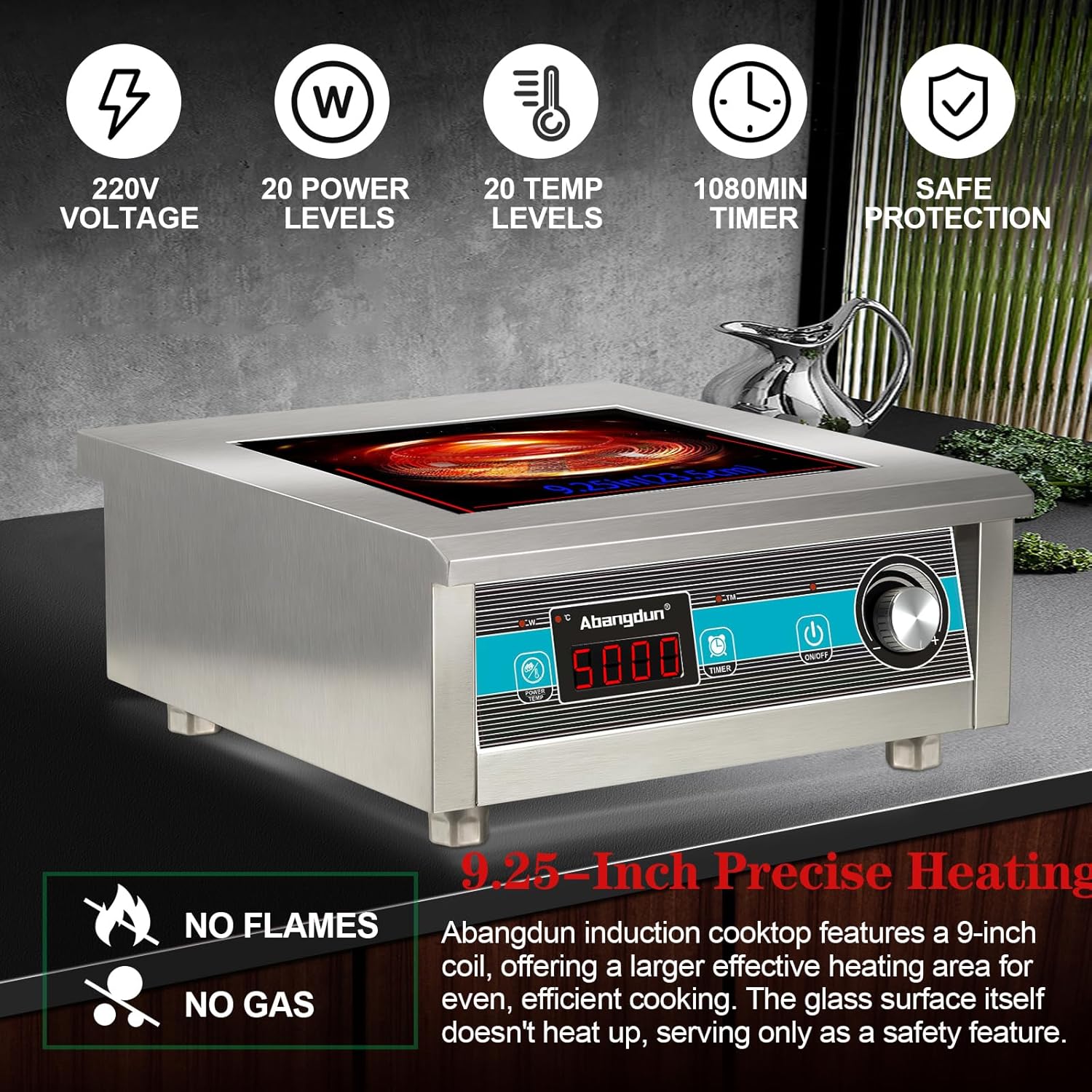 - 【Even Heating at All Power Levels】: Unlike other induction cooktops that use pulsing or cycling at lower power levels, the Abangdun induction cooktop provides continuous, even heating at all power settings. This eliminates temperature fluctuations, ensuring stable cooking results every time. Equipped with a 9.25-inch large coil, it offers a larger
