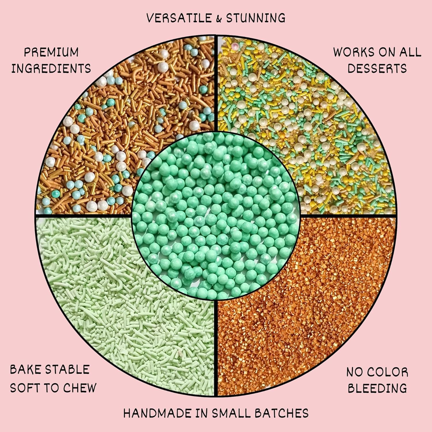 Confect Edible Sprinkles Mix Pack of 5 – Cool Summer Breeze Theme – Yellow Pearl Dragees, Mint Green & Gold Jimmies, Sparkling Gold Sugar – Cake & Cupcake Decorating Toppings - Vegan, Gluten-Free, Nut-Free, Soy-Free, Dairy-Free, Palm Oil-Free- 5 Oz