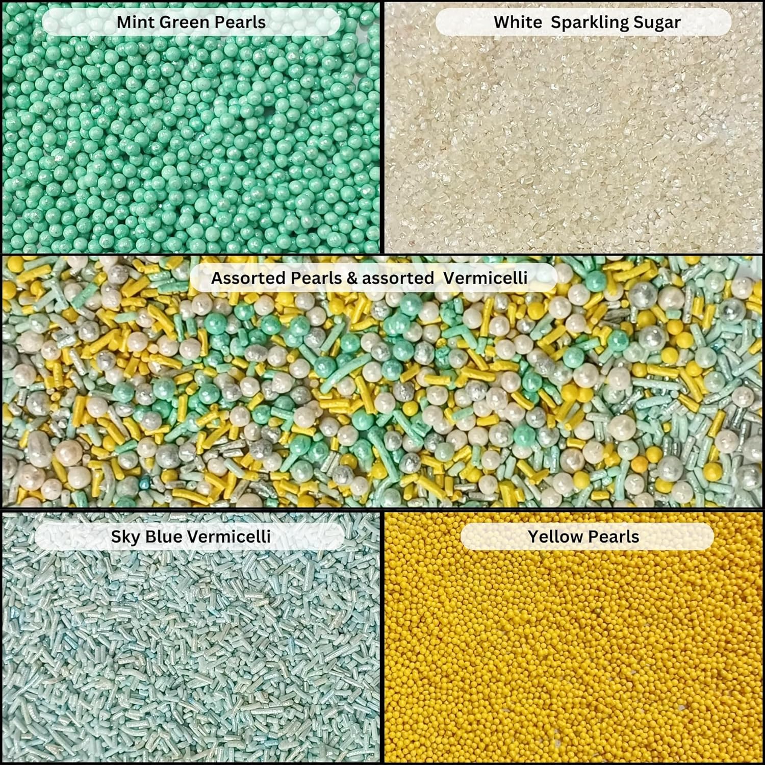 - Assorted Sprinkle Mix Pack (5 Varieties): Includes sky blue, yellow & white pearl dragees, jimmies, and sparkling sugar – perfect for creative dessert decorating.