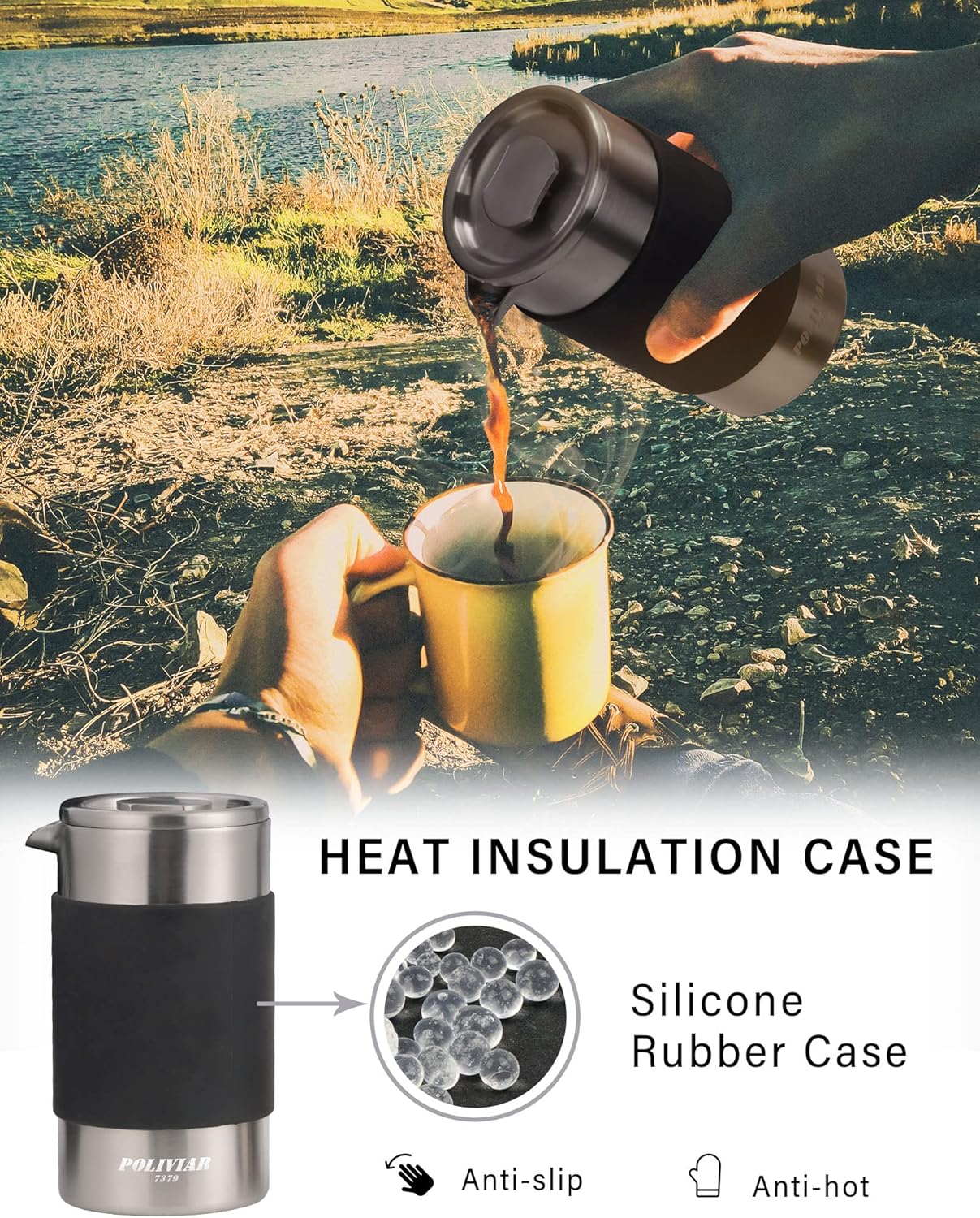POLIVIAR French Press Coffee Maker, 12 oz Portable French Press with Mini Canister and Collection Bag, Double Wall Insulation & Dual- Filter Screen, Food Grade Stainless Steel for Coffee