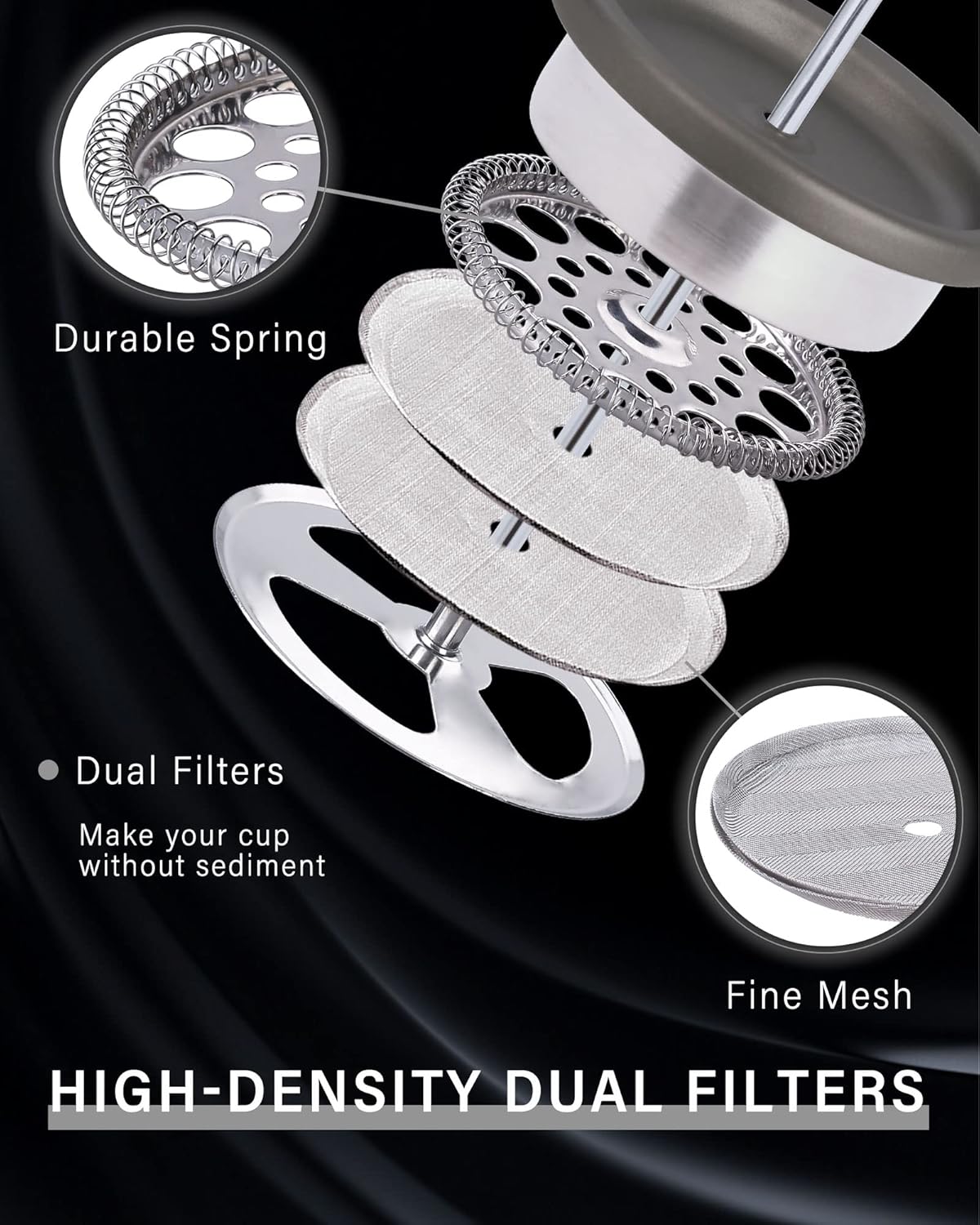 - DOUBLE WALL VACUUM INSULATION AND DUAL FILTERS - The double wall design of the french press coffee maker keeps coffee hot and the high-density dual filters structure can separate grounds from coffee perfectly, helping to make your cup without sediment and increase the smoothness of the brew. And the filters can be took apart easily for cleaning.