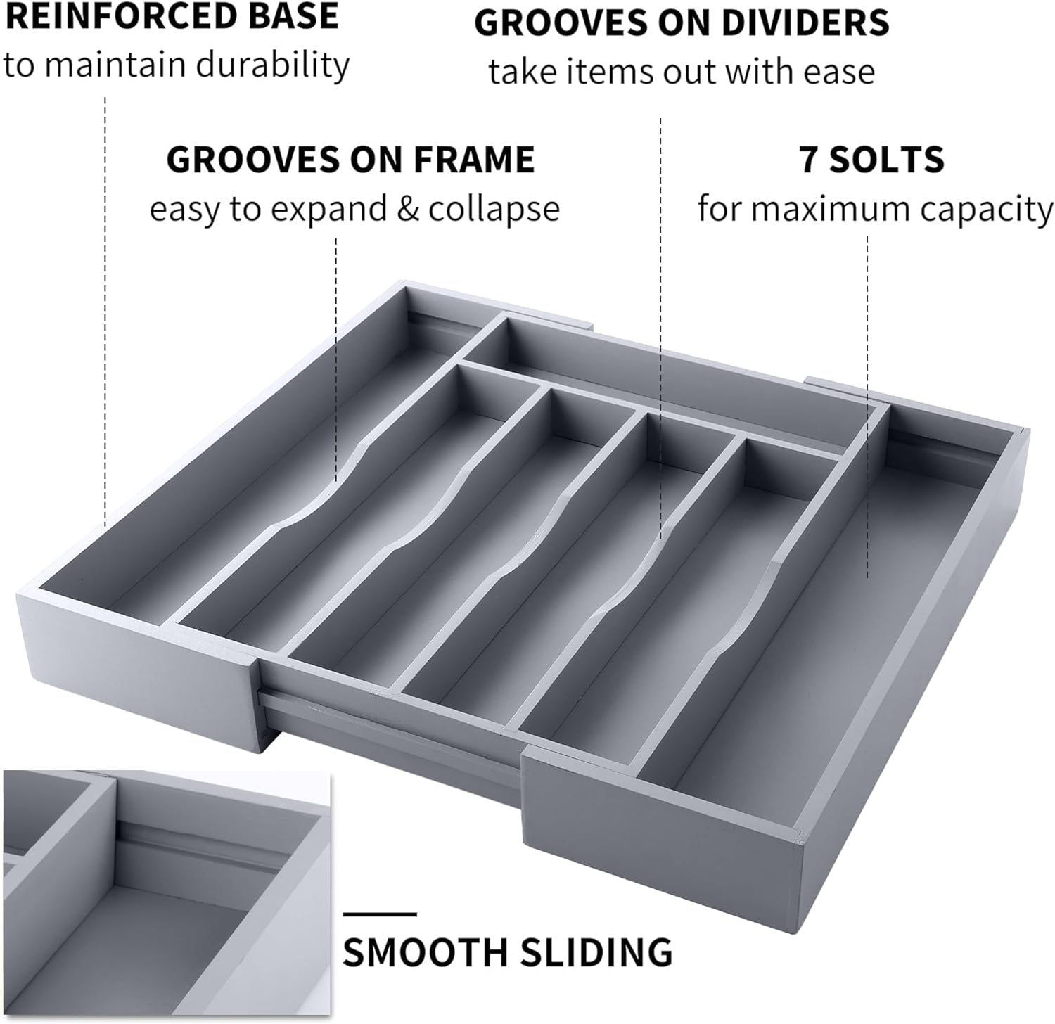 - Reliable Durability: Your natural and earth-friendly bamboo cutlery tray is sturdy and durable - not easy to crack and warp - thanks to a series of dehydration, drying and other processes to eliminate the inner stress. Well polished surface and edges will not hurt your hands. The Traditional tight assembly structure adds extra durability. With the smooth sliding design, your adjustable cutlery and utensils organizer can fit over 95% standard sized drawers.