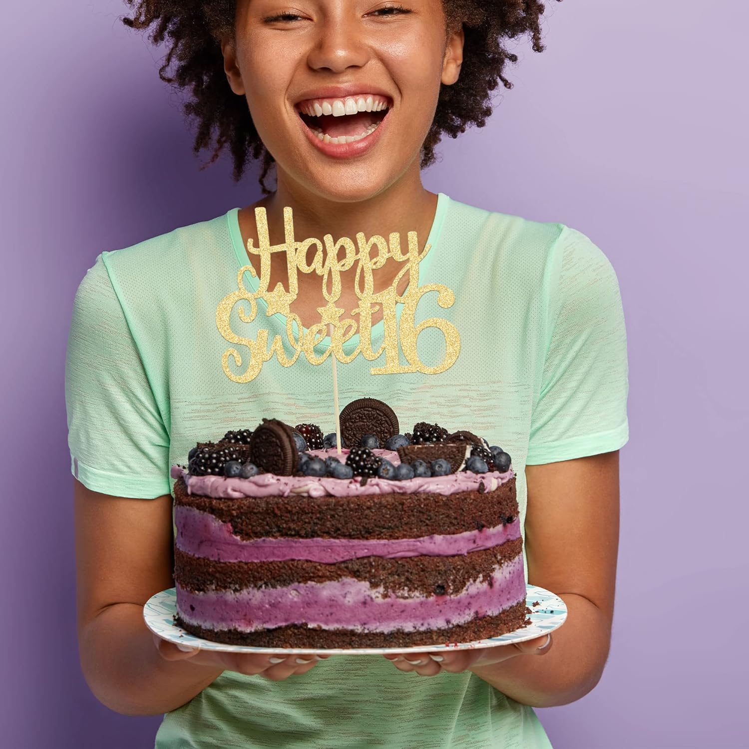 Gyufise 1Pc Happy Sweet 16 Cake Topper Gold Glitter 16th Birthday Cake Topper Sweet 16 Decorations 16th Birthday Decorations