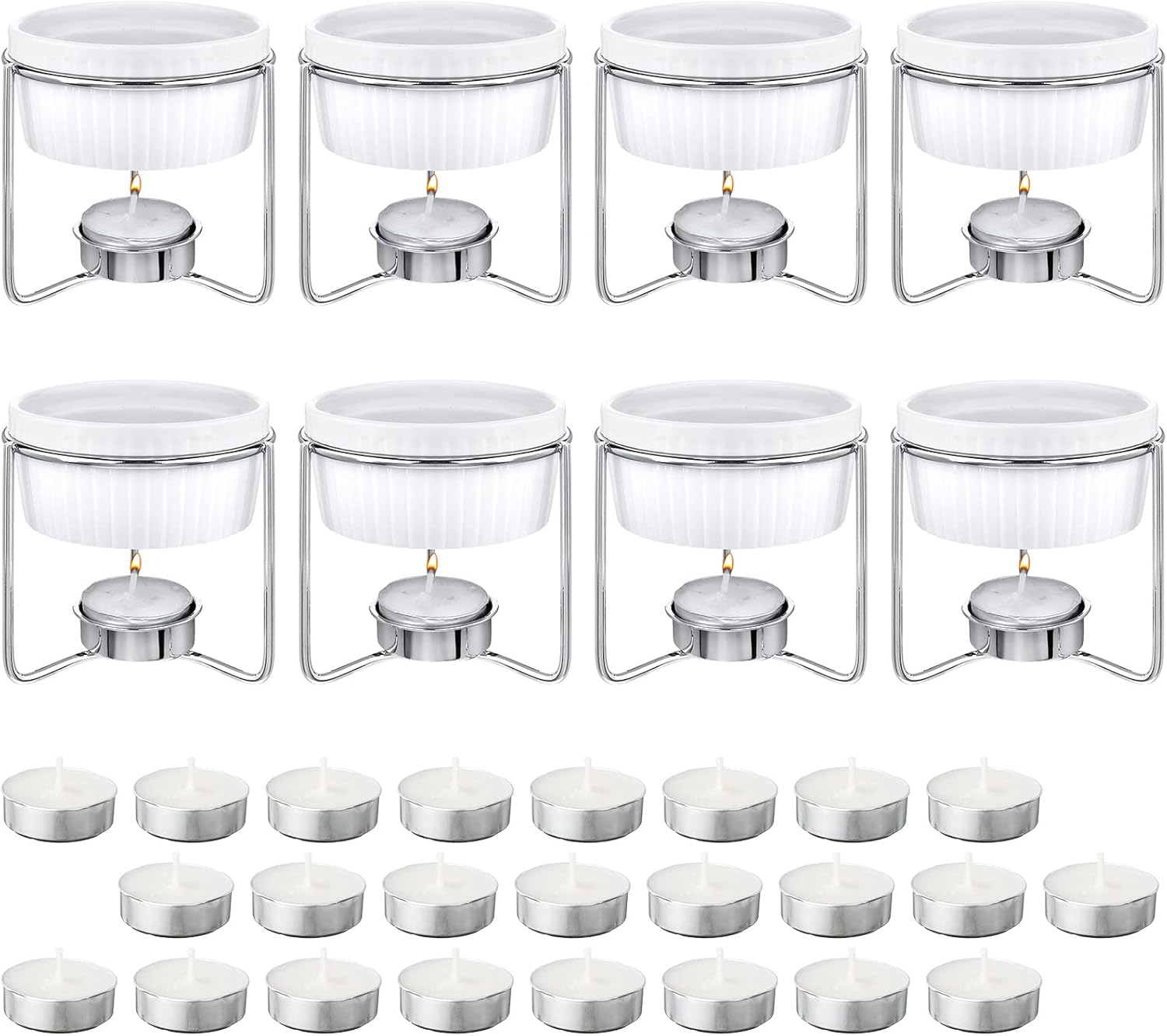 - Package Content: the package includes 8 butter warmers, 8 metal stents and 32 tea light candles, the diameter of ceramic heater is about 3.3 inches and the height is about 1.7 inches, the diameter of metal stent is about 3.5 inches and the height is about 3.2 inches, the nice sizes are proper for your home parties