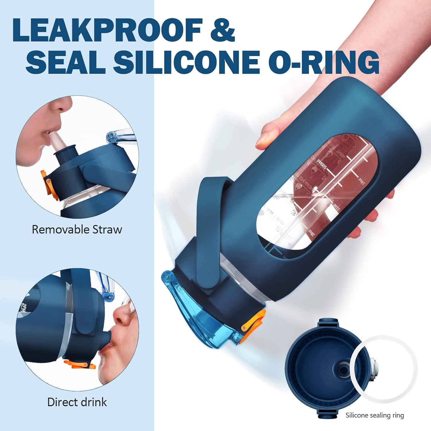 - ❤Glass Water Bottle with Pop-up Straw Lid- Our 64oz water bottle with straw is designed with an upgraded lid that ensures 100% leakproof and dustproof. Advanced one-click button makes you drink easier, just push the button and the straw will pop out automatically.
