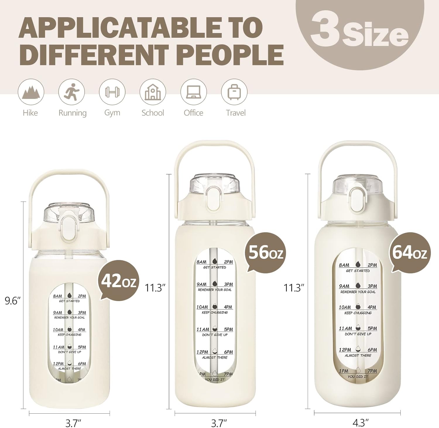 - ❤More Function- Our glass water bottle with stylish silicone sleeve which provides more grip and prevents the water bottle from slipping out. -This large motivational water bottle has a wide mouth, not only easy to hold ice cubes and fruit but also very easy to clean, you can use our complimentary cup brush to clean your water glass. -Handle on the lid for easy portability.