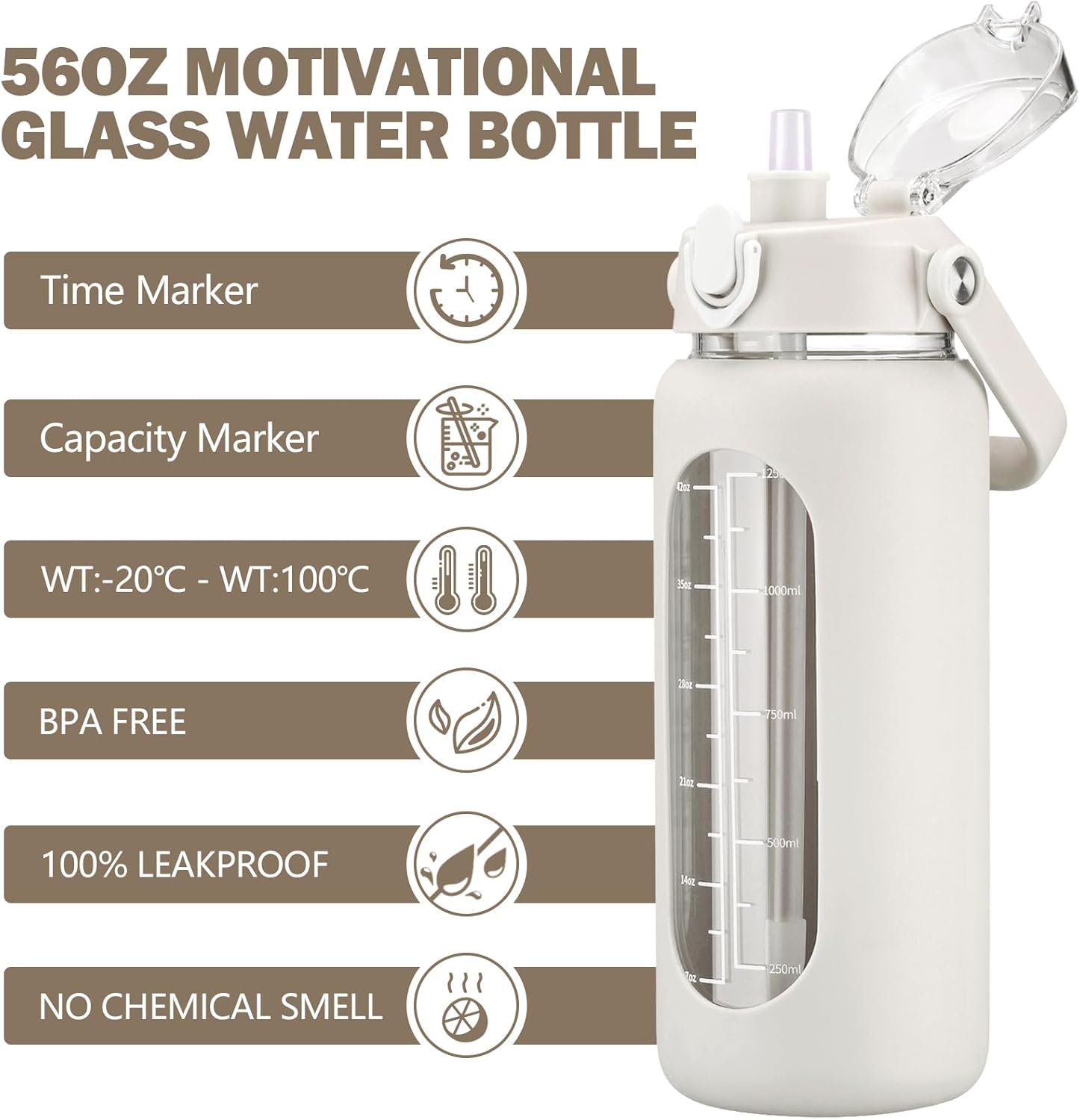 kytffu 56oz Glass Water Bottles with Straw, Motivational Glass Bottle with Silicone Sleeve and Time Marker, Leakproof Large Glass Water Jug for Gym Home Office,White