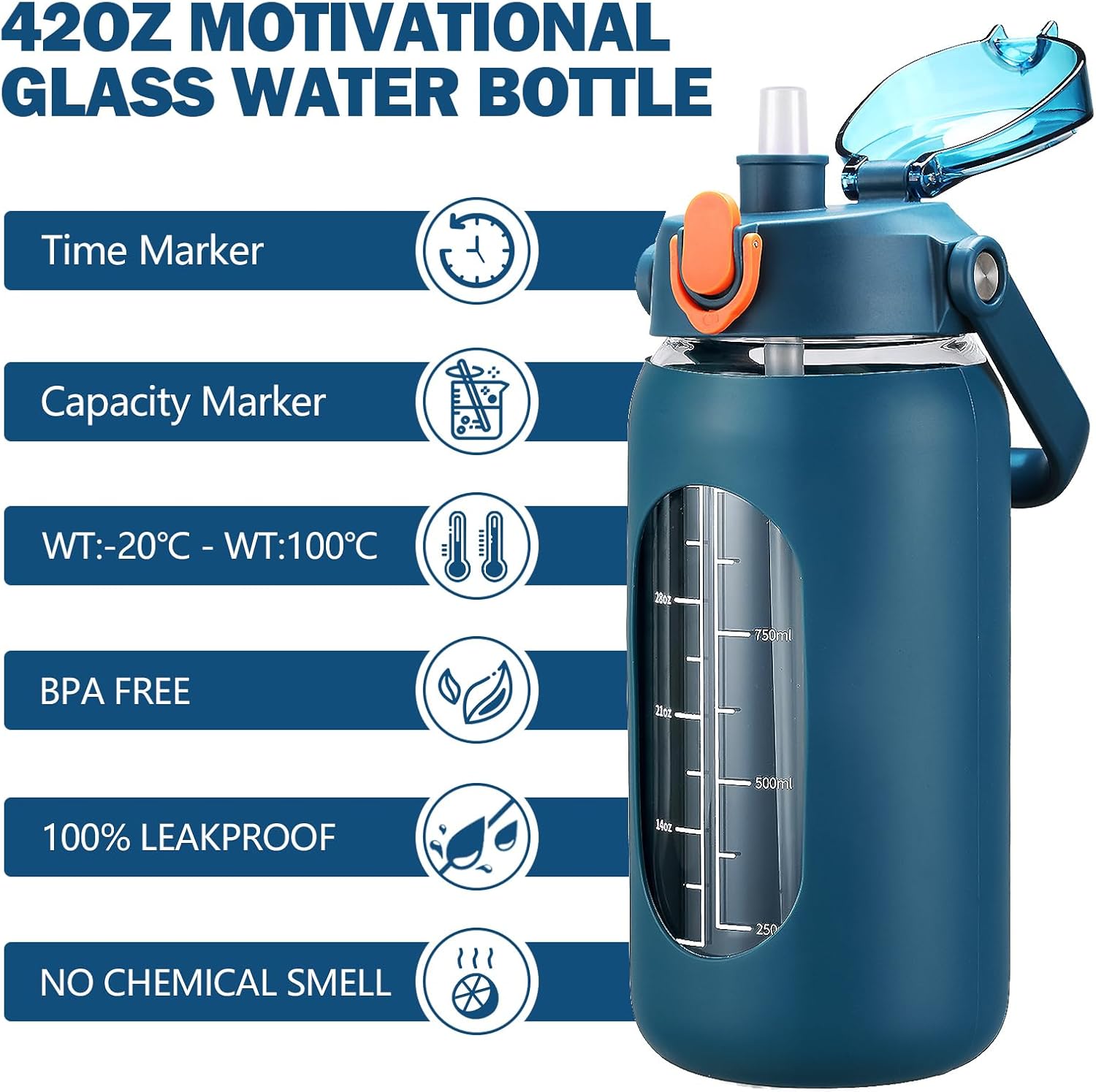 kytffu 42oz Glass Water Bottles with Straw, Motivational Glass Bottle with Silicone Sleeve and Time Marker, Leakproof Large Glass Water Jug for Gym Home Office,Blue