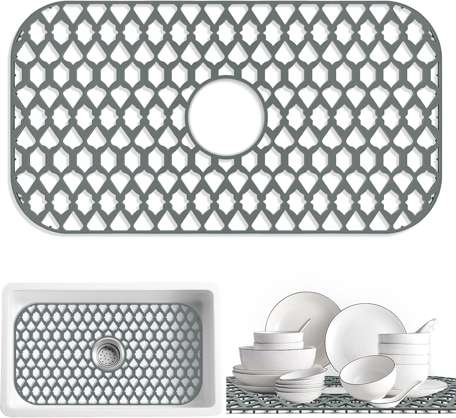 Large Sink Protectors for Kitchen Sink 19”x13”& 24”x13”& 26”x14”, Silicone Sink Mats Grid for Bottom of Farmhouse Stainless Steel Porcelain Sink (26”x14”, Center Drain)