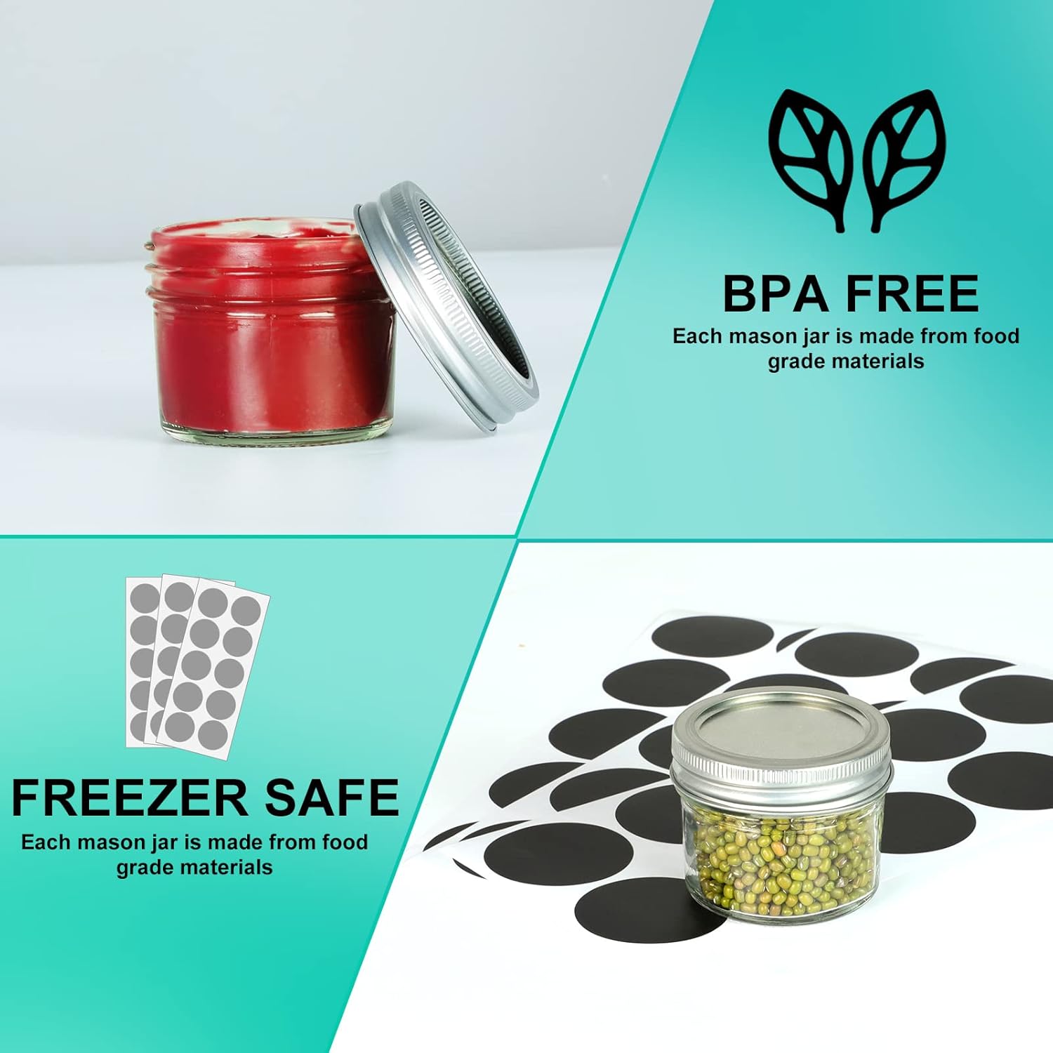 - FOOD GRADE:Each mason jar is made from food grade materials.Great for food storage.Perfect for preserving and canning. Safe for the refrigerator and the freezer.