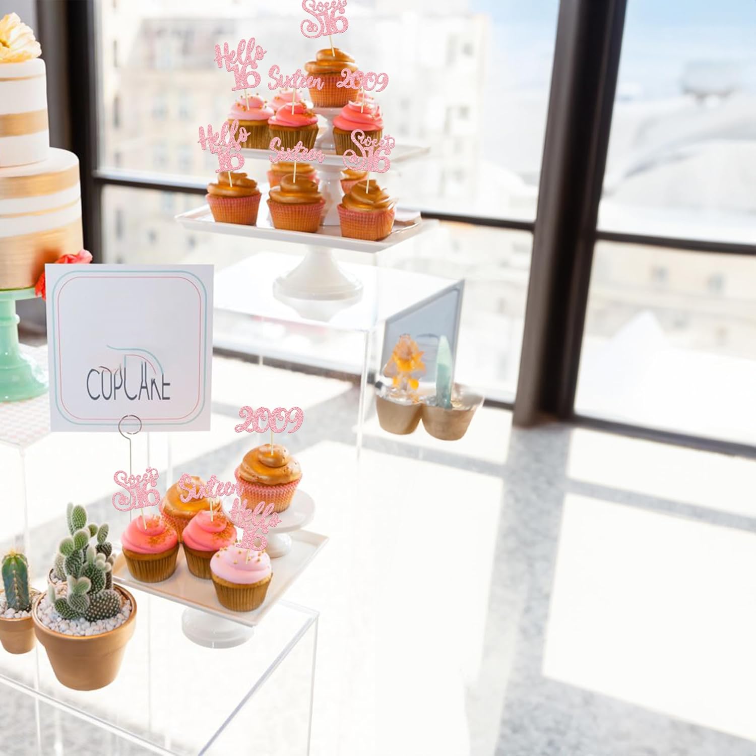 Gyufise 24Pcs Happy 16th Birthday Cupcake Toppers Glitter Hello 16 Sweet 16 Sixteen Years Old Cupcake Picks for Celebrating 16th Birthday Anniversary Party Cake Decorations Supplies Pink
