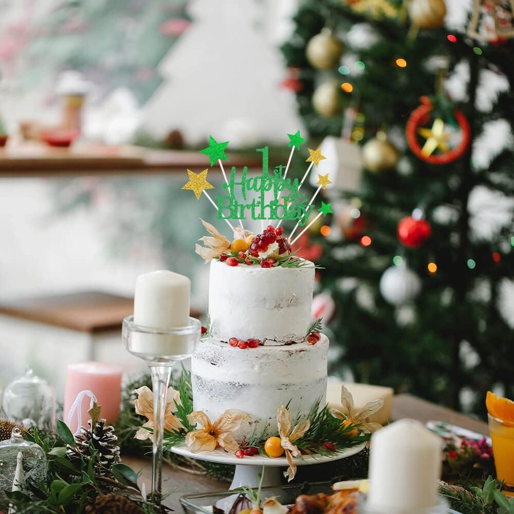 Glittery 1st Happy Birthday Cake Topper with Star,Personalised 1 Birthday Cake Toppers Party Decorations Party Supplies for Baby Boys Girls Green Gold