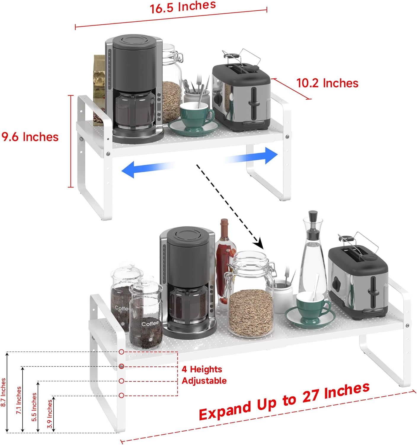 - Expandable &Stackable Cabinet Shelf Organizer: The width and height of the expandable kitchen cabinet shelves can be adjusted according to your needs, which is a very practical storage shelf. The dimensions before expansion are 16.5 "L x 10.2" W x 9.6 "H. Its length can be extended from 16.5" to 27". You can also stack the 2pack shelves together to form a two-layer storage space. Or it can be used as 2 single shelves separately